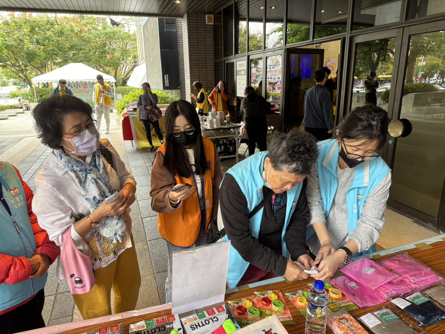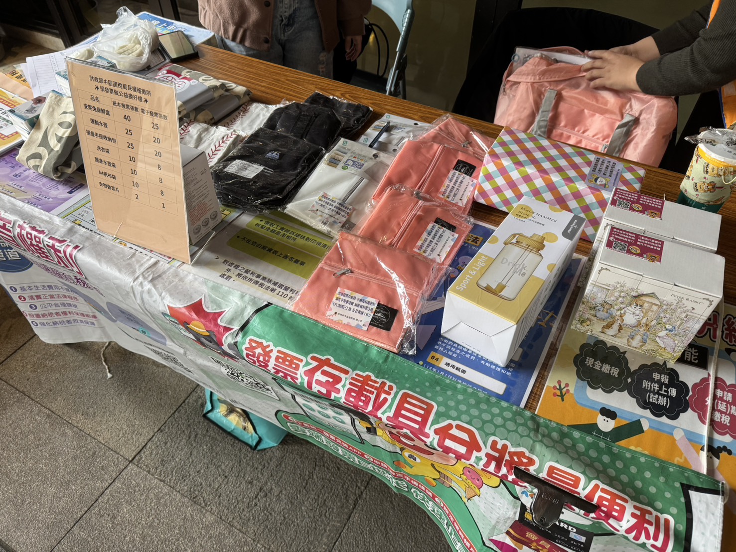 攤位提供多樣性宣導品,參與民眾可以捐發票做愛心來兌換。