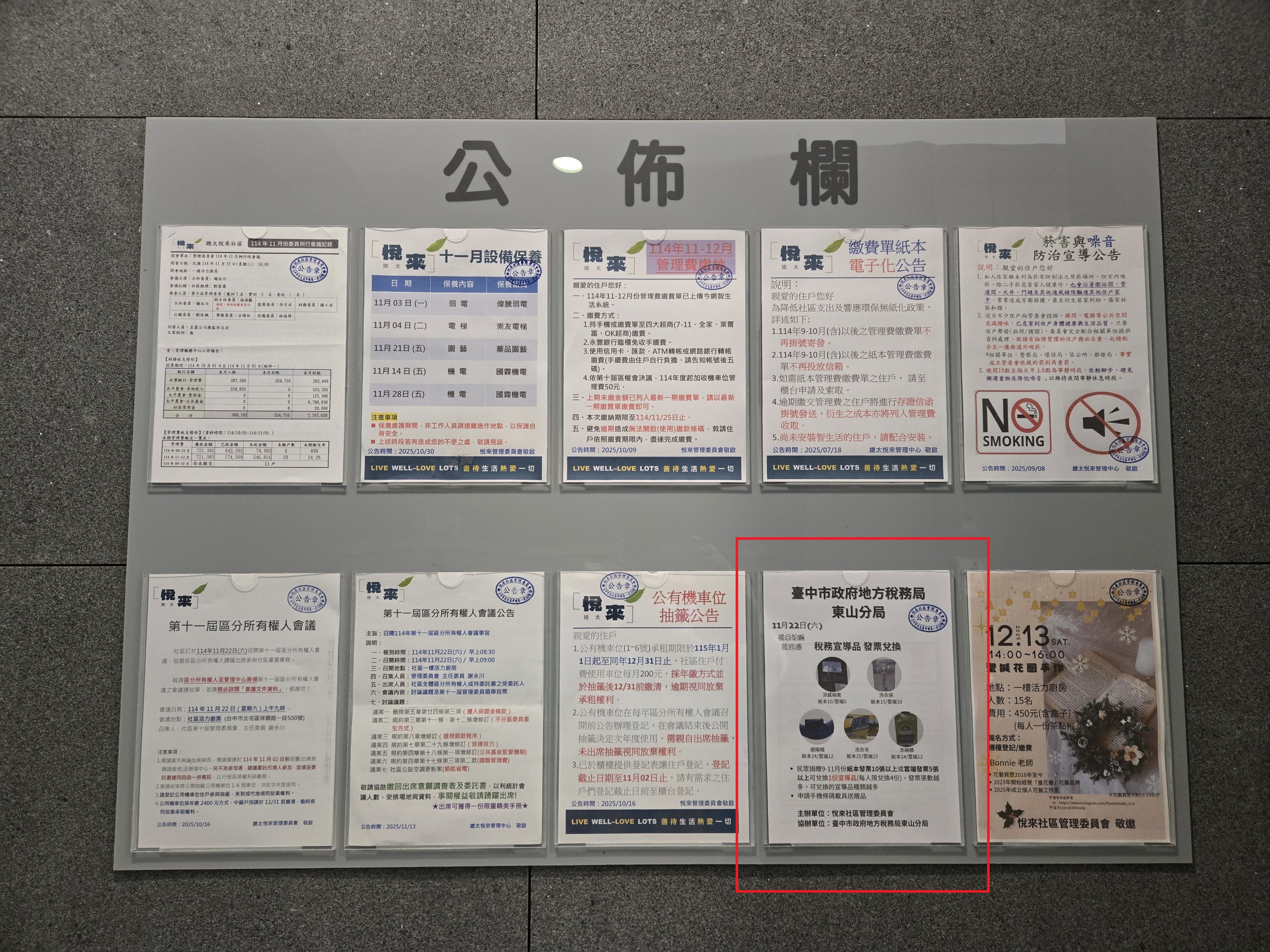 社區公佈欄張貼稅務攤位宣傳內容,提高宣導能見度。
