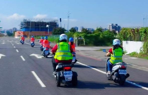 志工在駕訓班機車考驗場訓練平衡測試等。