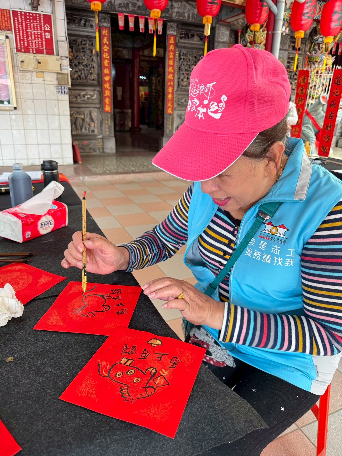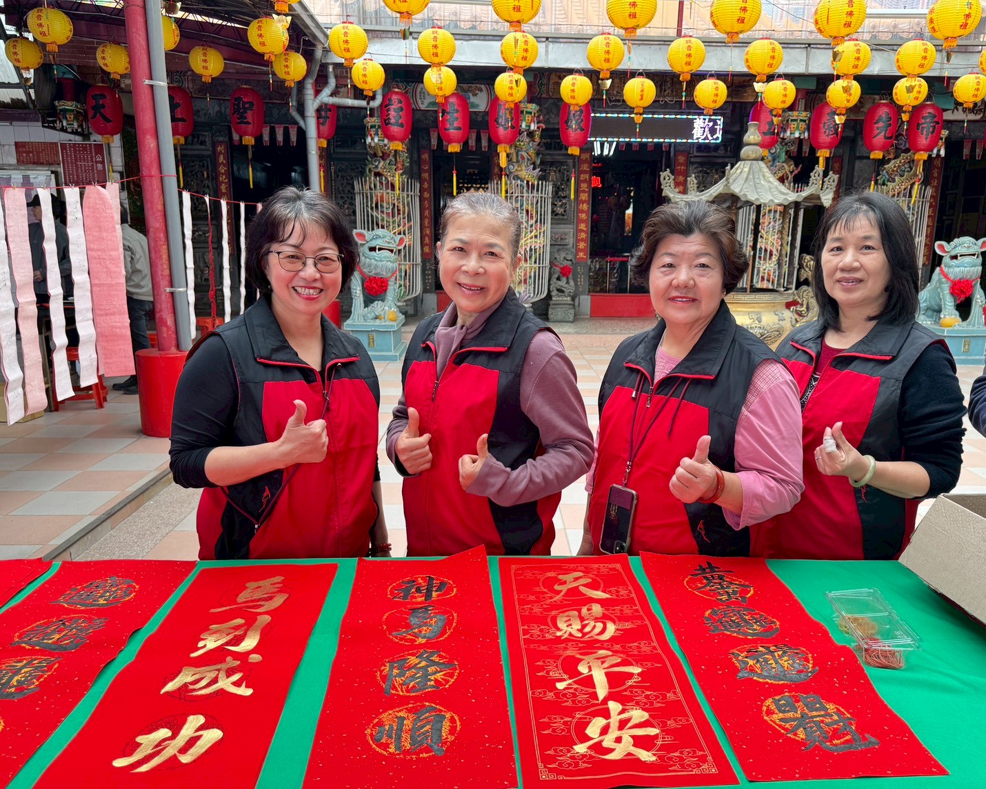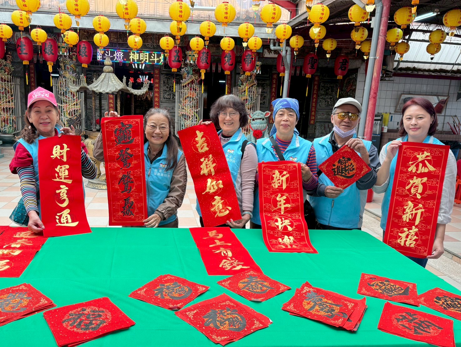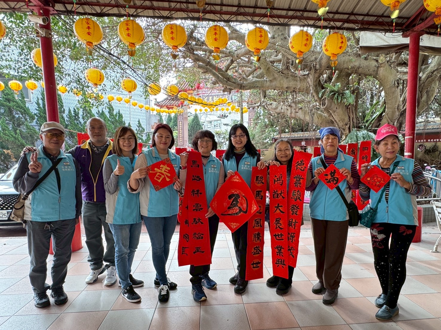 志工夥伴展示社區春聯感受過年熱鬧氛圍