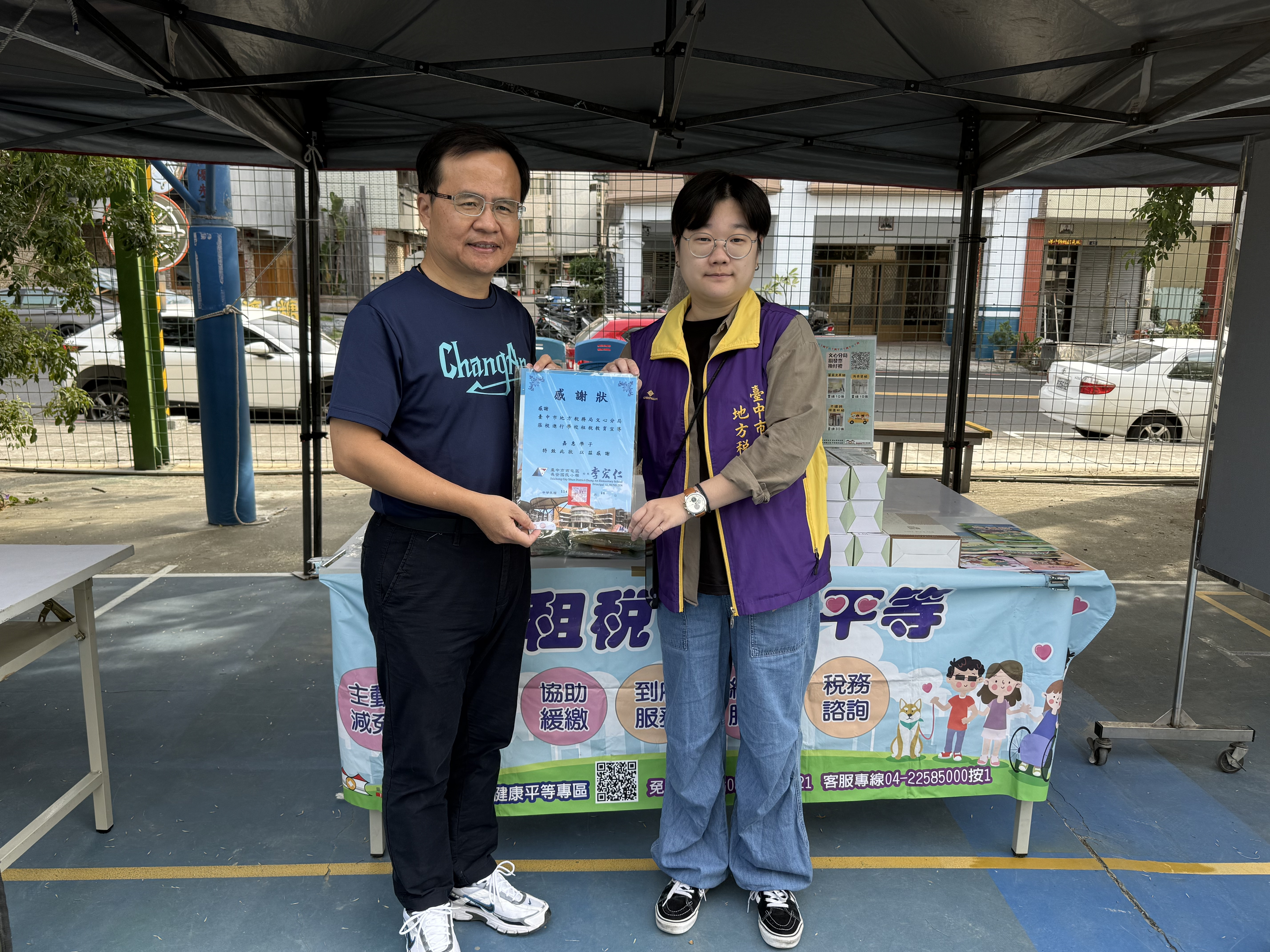 熱情的校長前來慰勞設攤的工作人員,幫大家加油打氣並致贈感謝狀,開心與同仁合影留念。