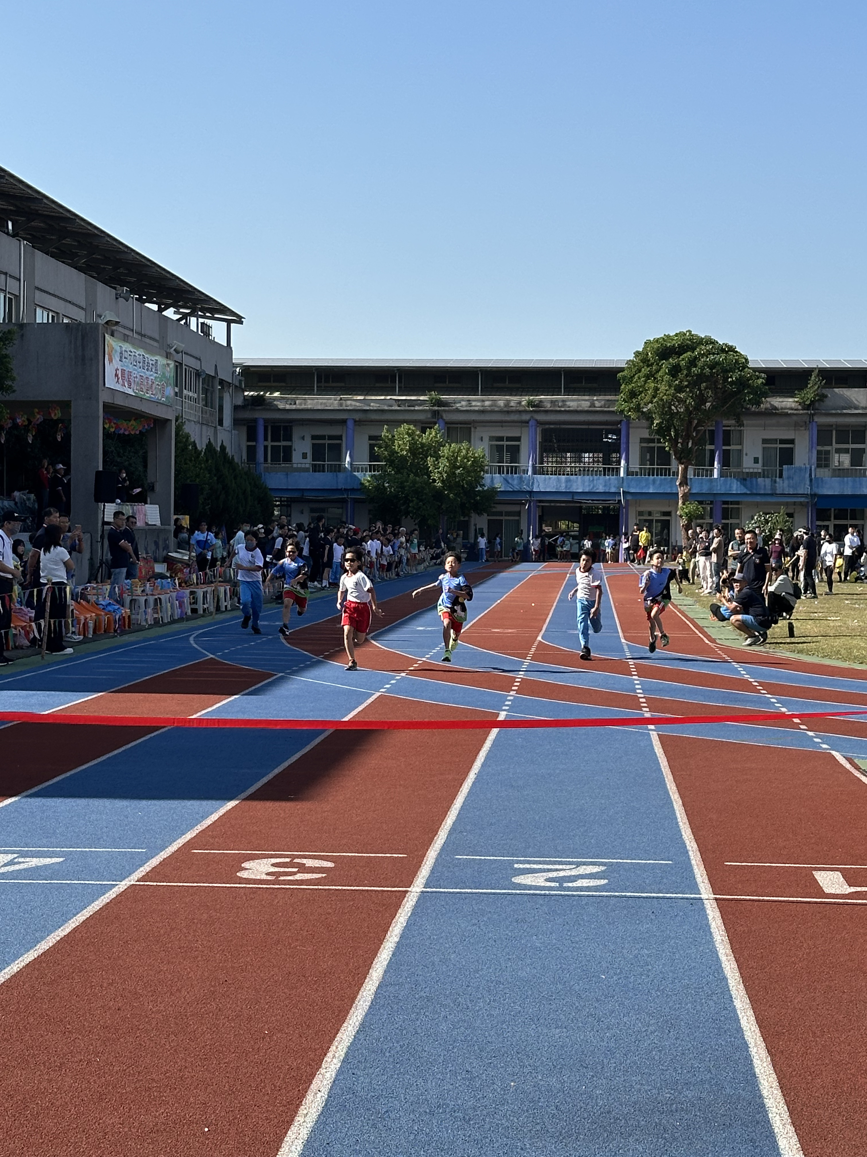 又到了緊張刺激的100公尺決賽,小朋友們奮力在賽道上奔跑,旁邊傳來親友及同學吶喊的加油聲,全力衝線爭取榮譽。