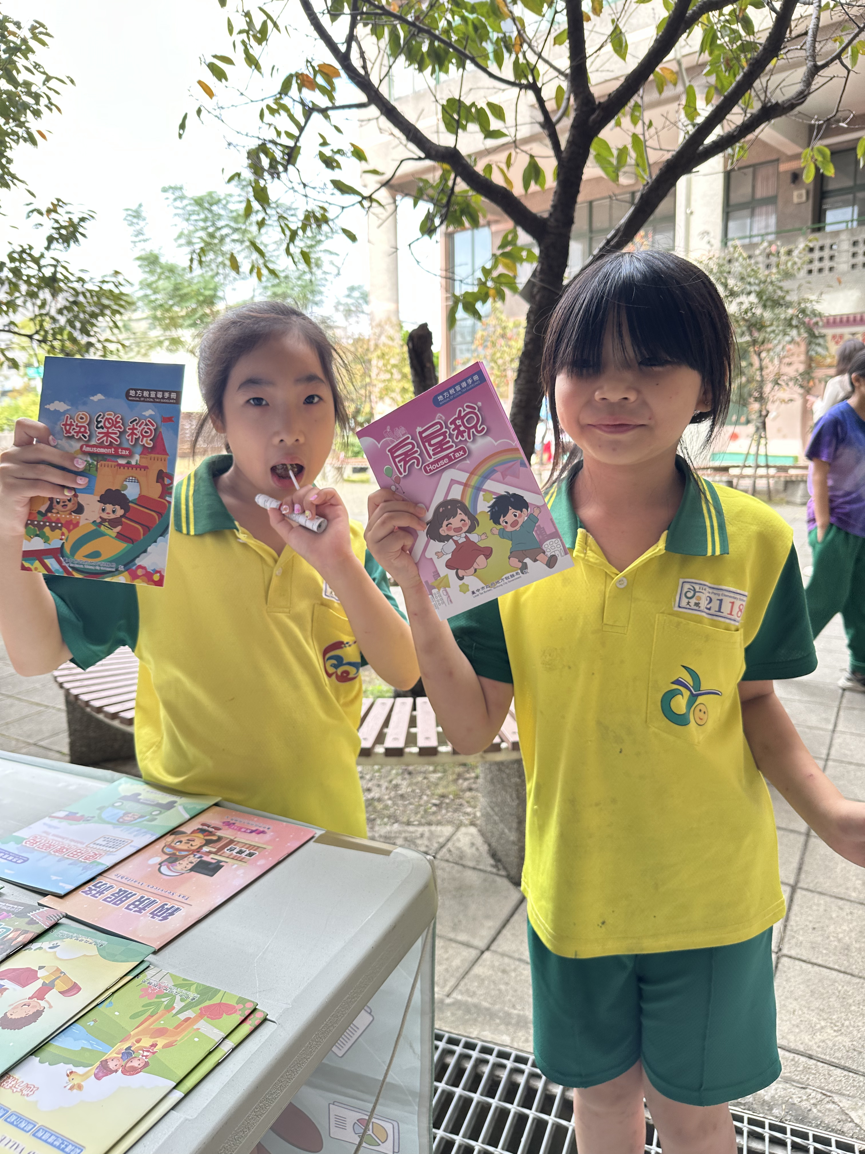 攤位提供各稅文宣手冊供民眾及小朋友取閱,小朋友開心索取並拍照留下紀念。