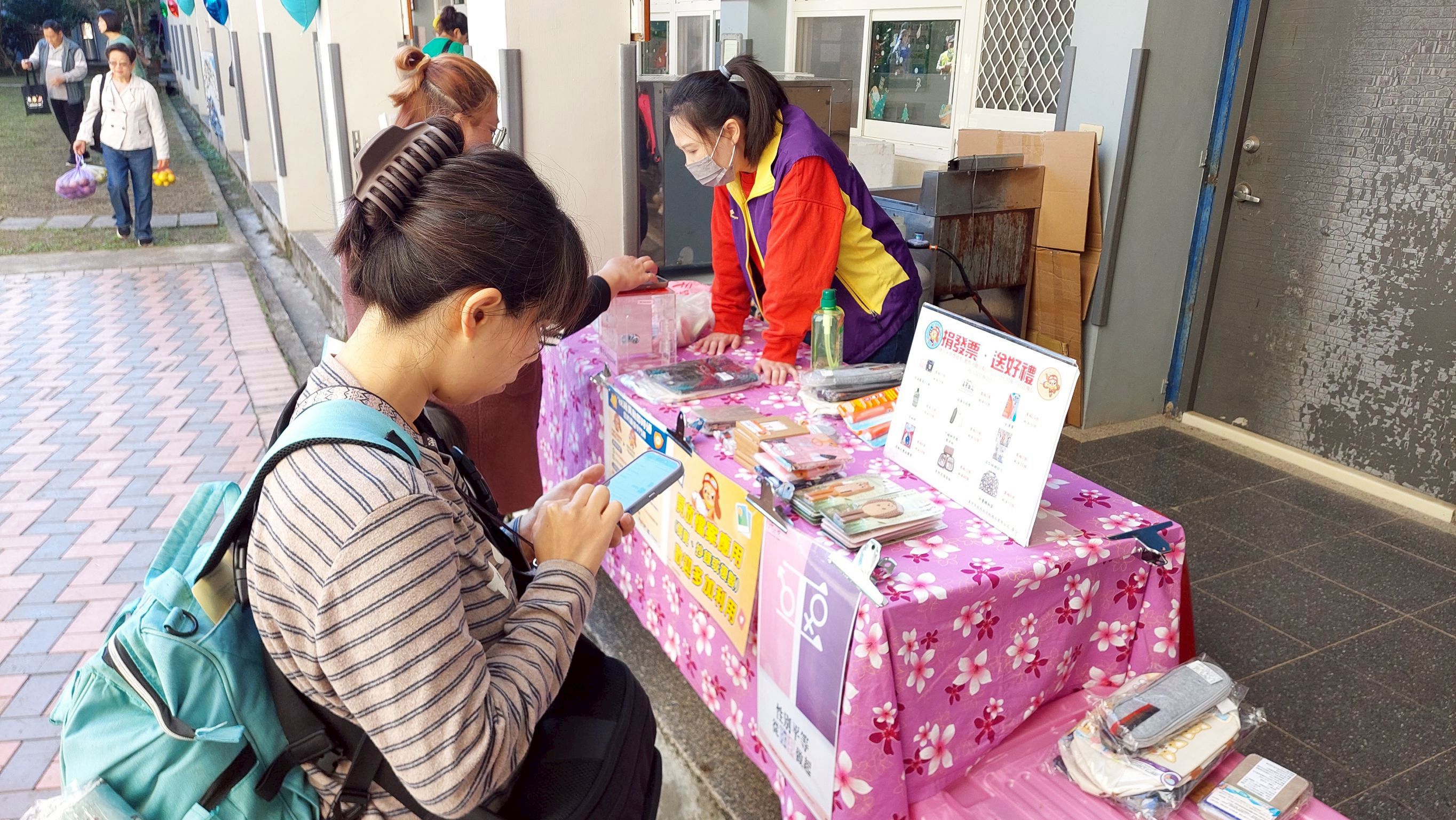 同學及家長們來到宣導攤位學習租稅知識,同時踴躍地捐贈發票做愛心,兌換精美實用的宣導品。