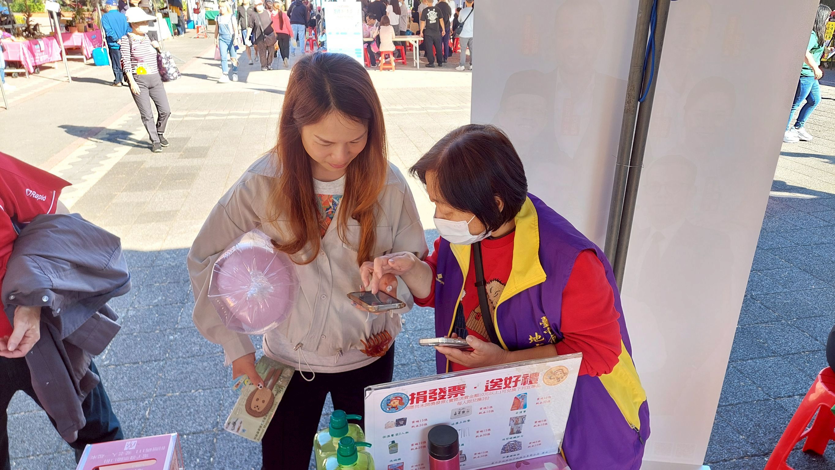 參訪的遊客在觀賞臺中購物節活動表演之餘,來到租稅宣導攤位下載實用的「統一發票對獎APP」,並踴躍捐贈發票兌換精美實用的宣導品。