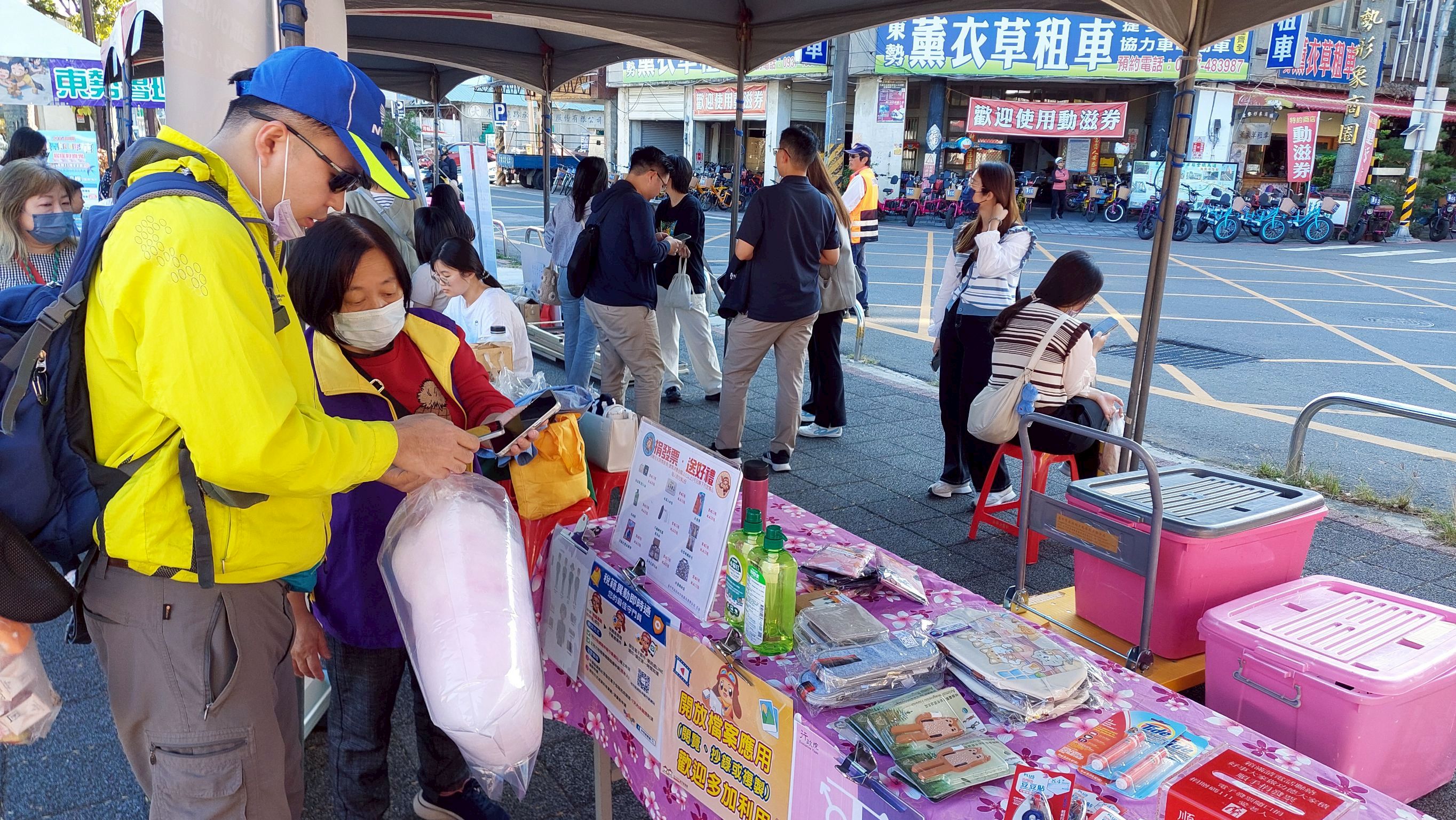 東勢分局114年11月22日配合臺中市政府「2025臺中購物節-東勢商圈美食嘉年華」辦理「FUN心購物,愛心雲端」設攤宣導活動