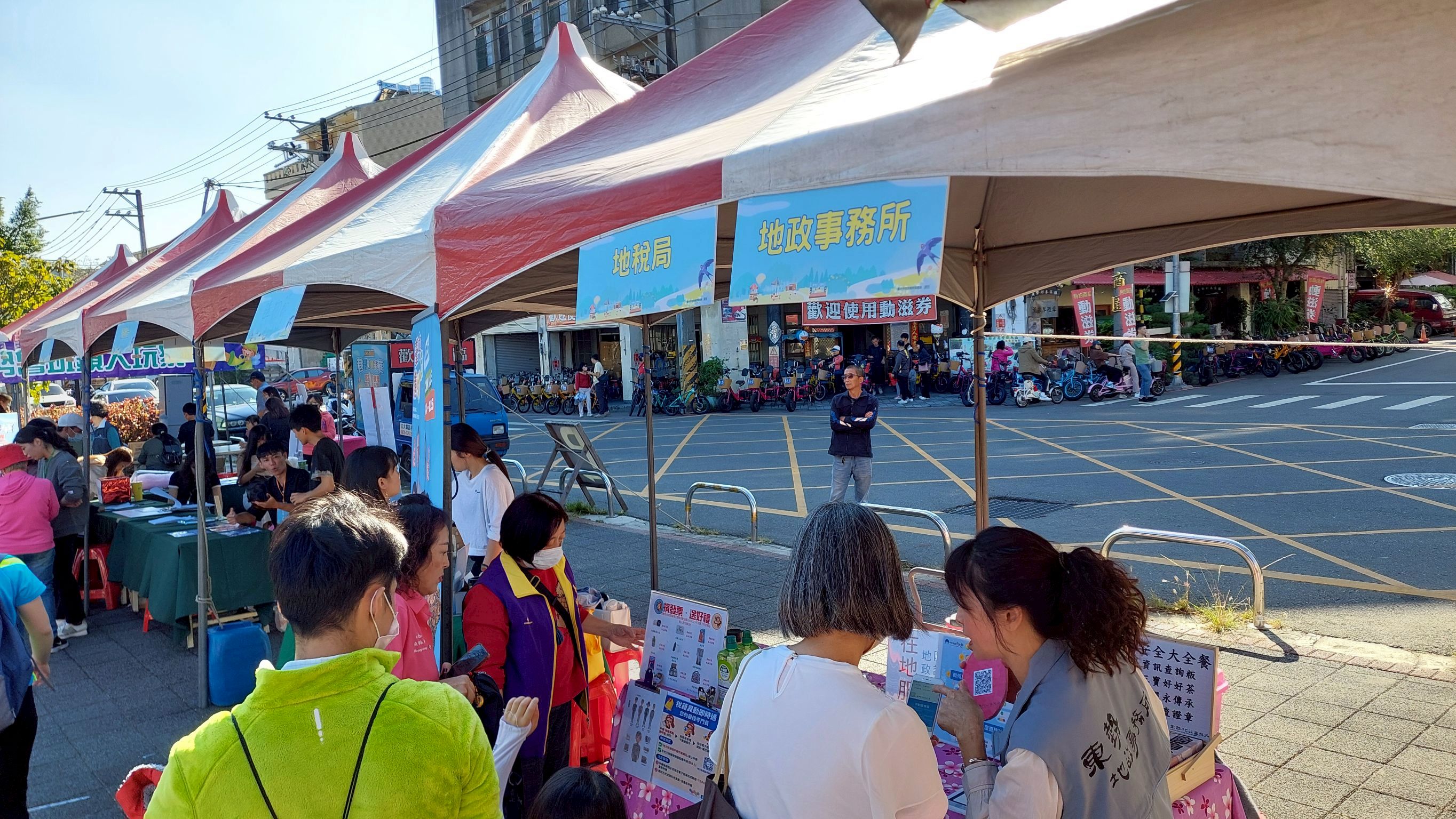 東勢分局與好鄰居東勢地政事務所一起在東勢客家文化園區「2025臺中購物節-東勢商圈美食嘉年華」活動進行宣導。