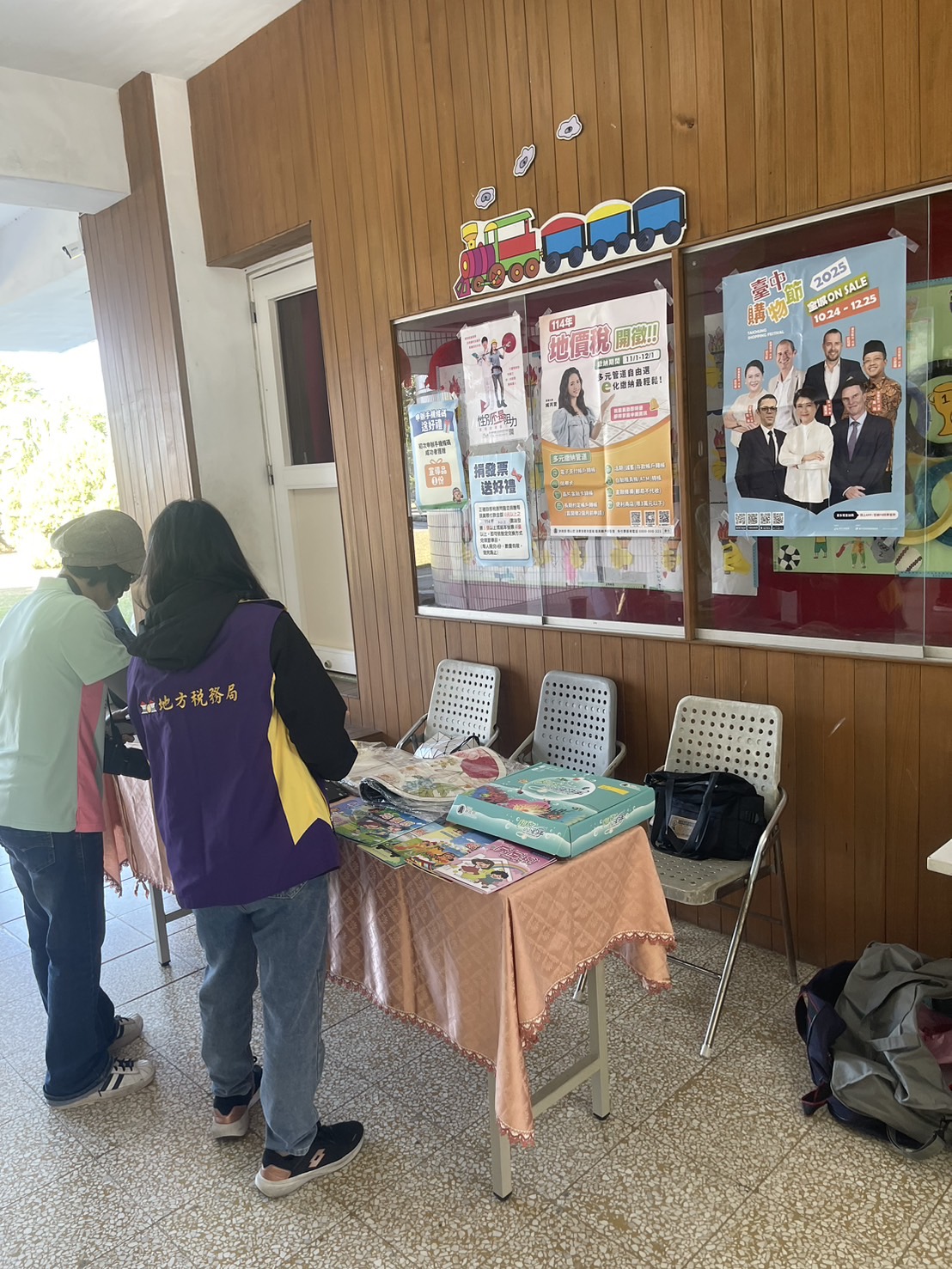 設置宣導服務台,提供地方稅各稅宣導手冊供民眾免費索取;張貼海報宣傳114年地價稅於11月開徵,民眾可多加利用行動支付繳稅及2025臺中購物節與性平等訊息。