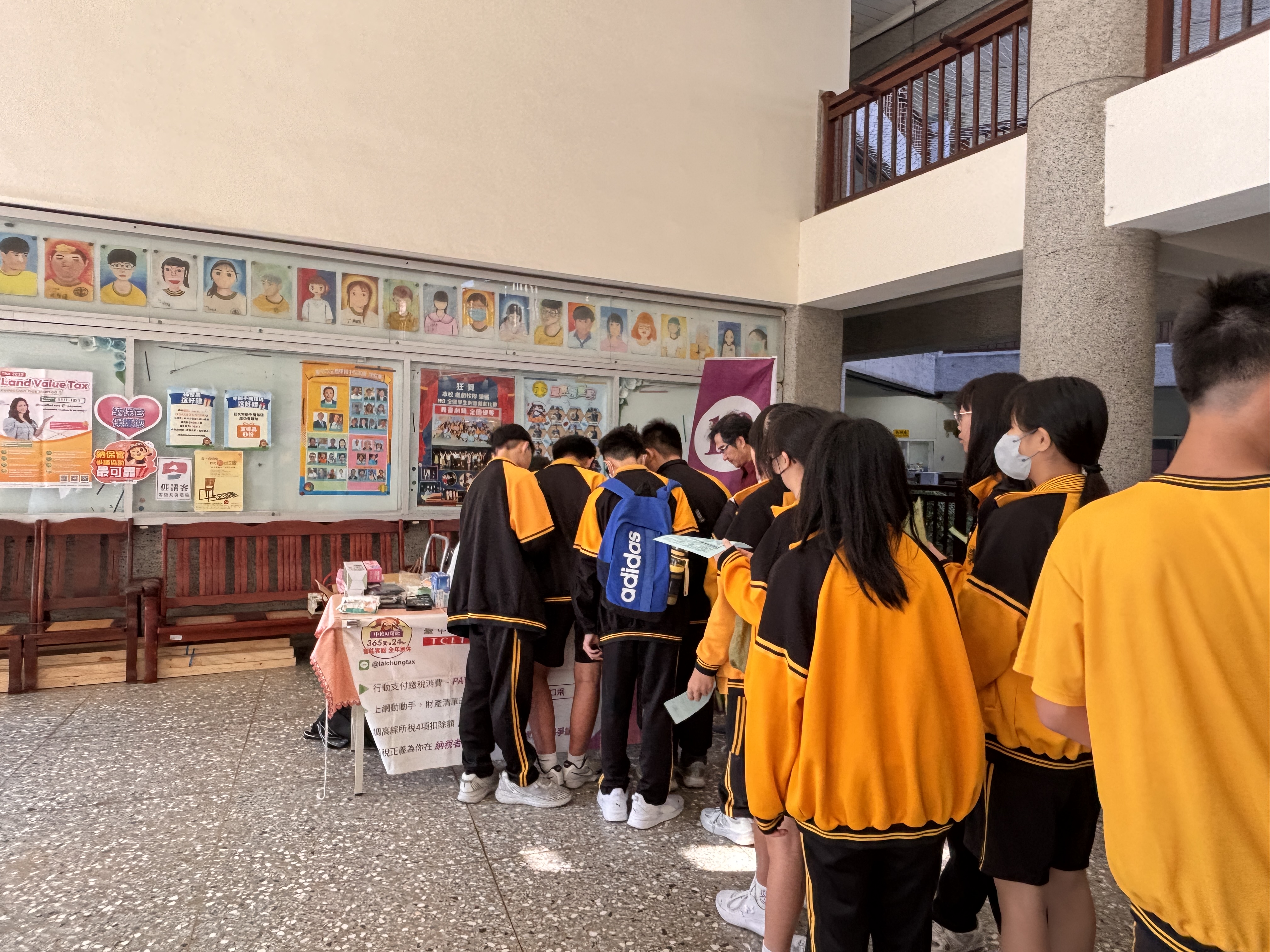 懸掛布條宣傳申請雲端發票手機條碼及下載「統一發票兌獎」APP的便利性;張貼海報宣傳114年地價稅11月開徵及性平訊息;同學門排隊踴躍參加闖關活動。