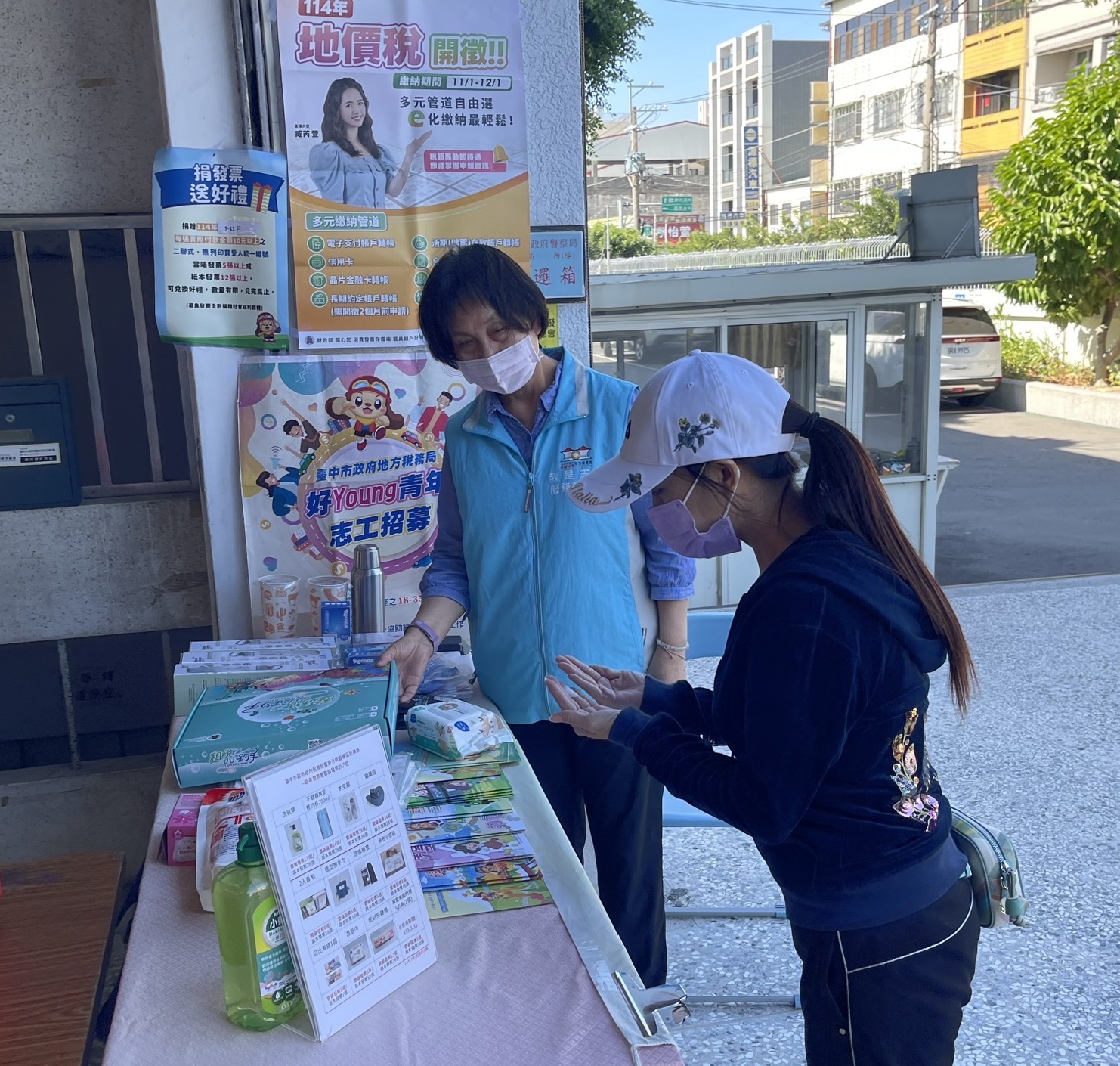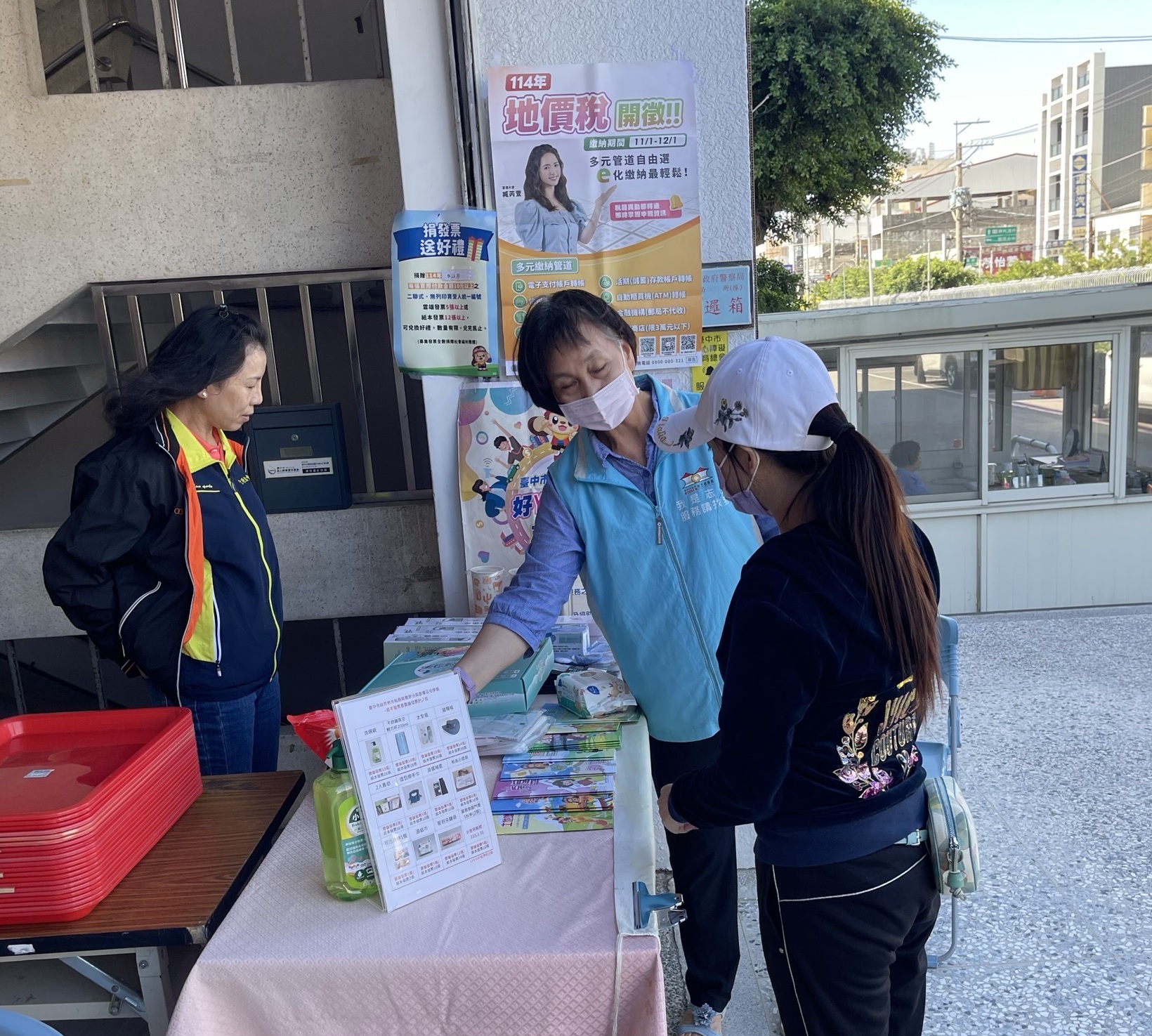 設置宣導服務台,提供地方稅各稅宣導手冊供民眾免費索取;張貼海報宣傳招募志工等訊息;志工協助民眾參加捐發票、送愛心、兌換好禮活動。