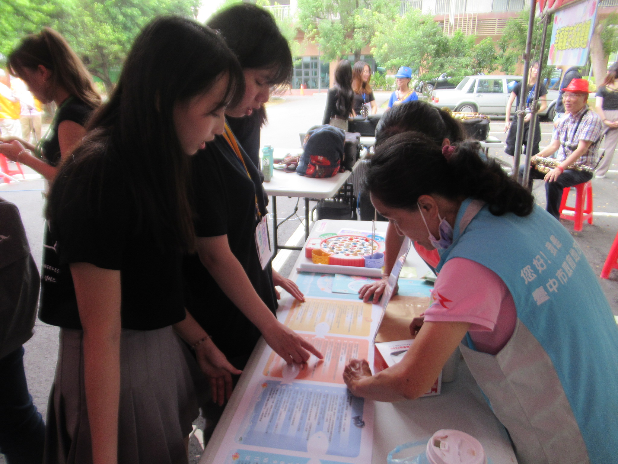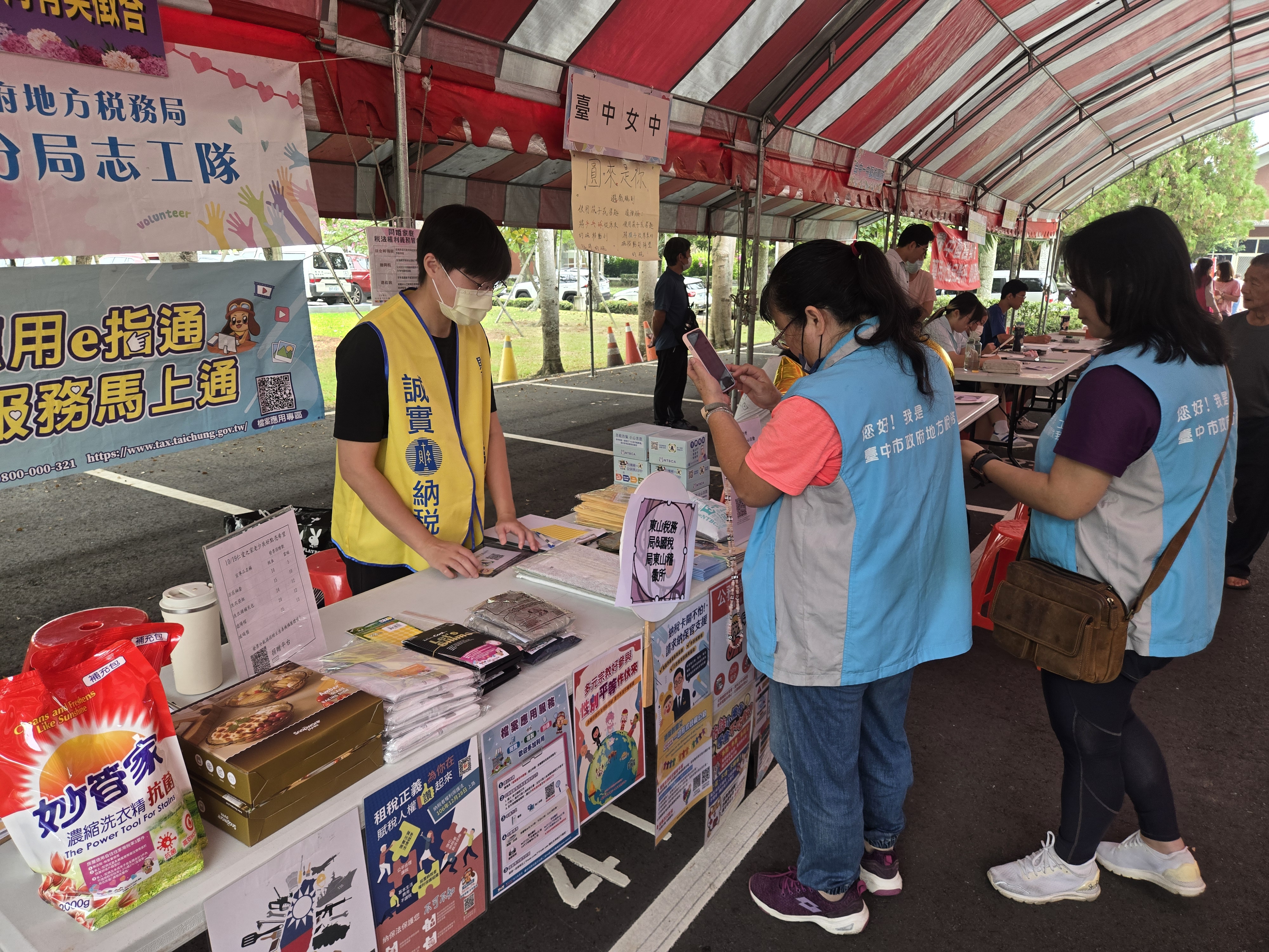 透過重陽敬老活動,志工們於攤位一同協助宣傳納稅者權利保護、使用統一發票兌獎APP等。
