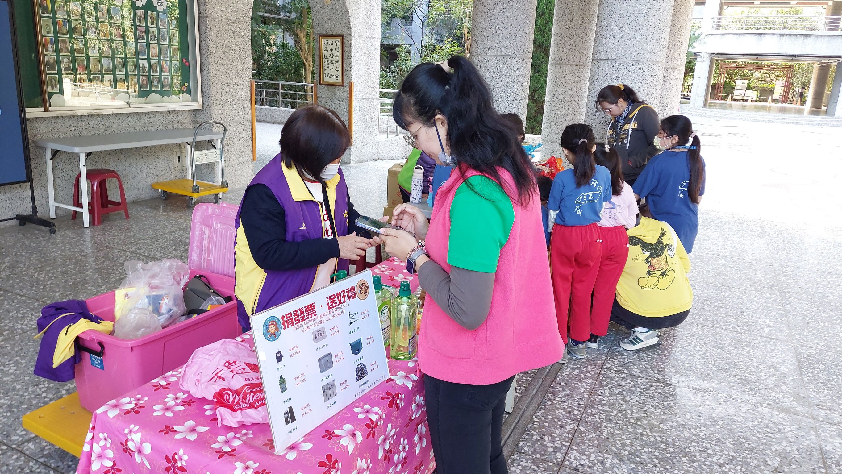 工作夥伴向學生及家長推廣下載實用的「統一發票兌獎APP」,並踴躍捐贈發票兌換精美實用的宣導品。