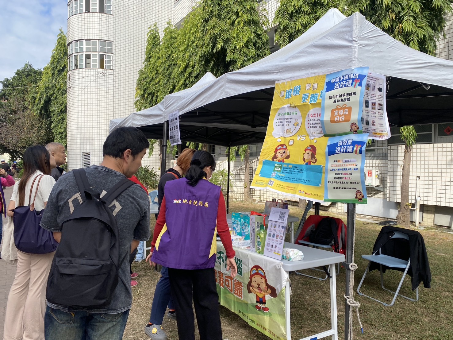 感謝學校邀請本分局配合校慶辦理租稅宣導活動,攤位活動包括舉辦捐發票送愛心及免費索取地方稅各稅宣導文宣等內容,吸引民眾參與。