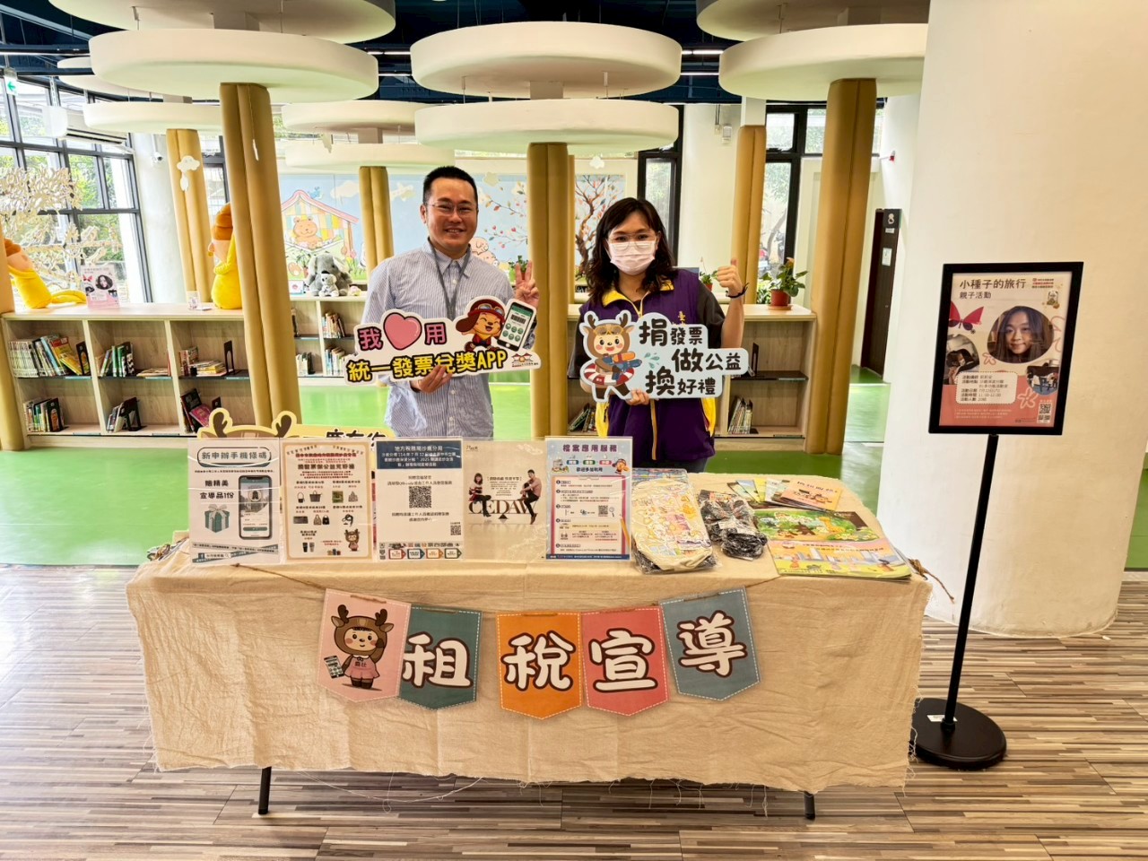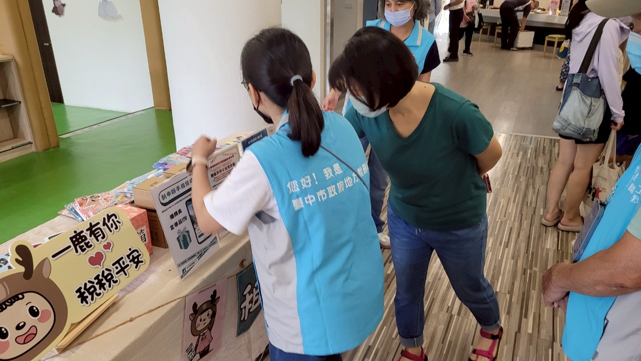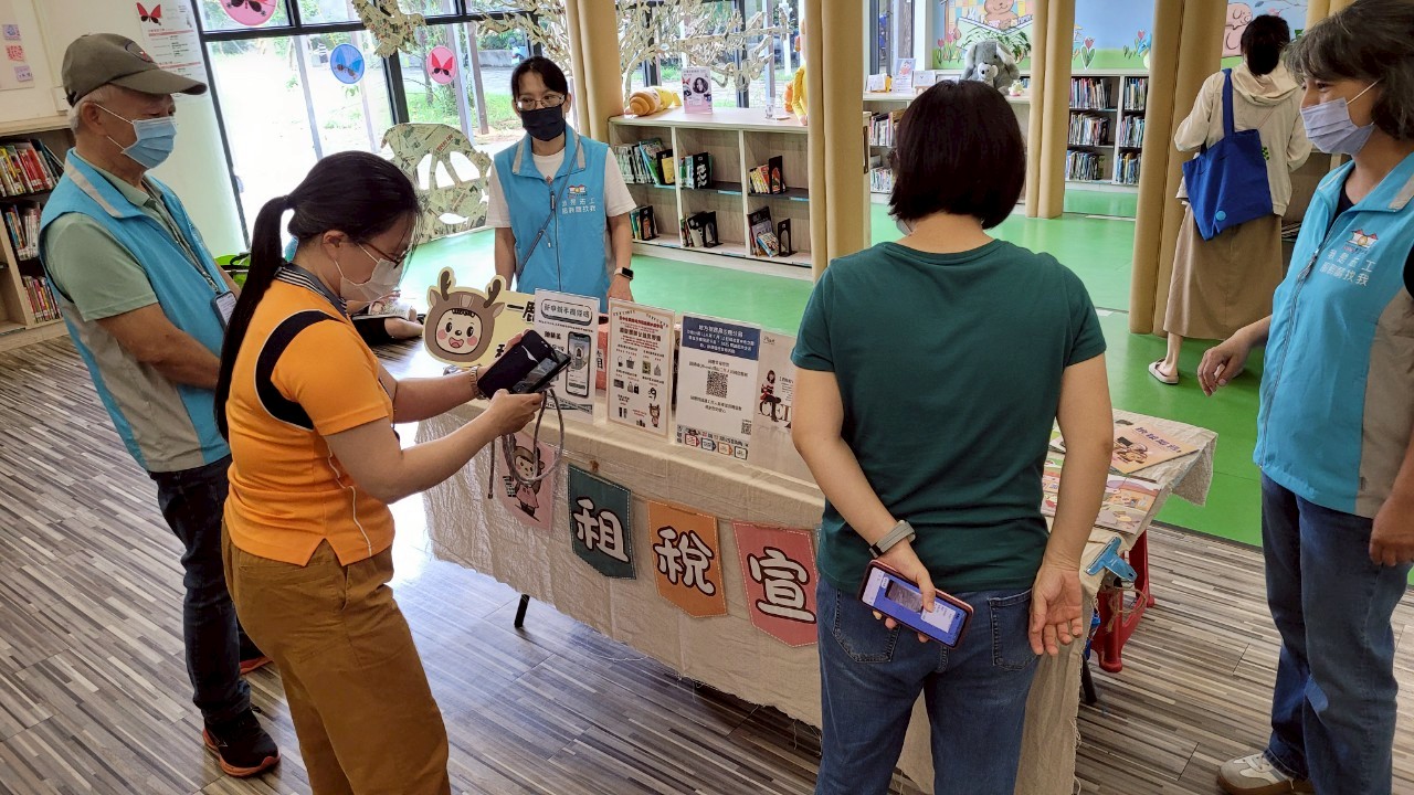 臺中市立圖書館沙鹿深波分館許主任蒞臨現場與宣導同仁將各式宣導用品就定位,準備好向民眾進行租稅宣導。