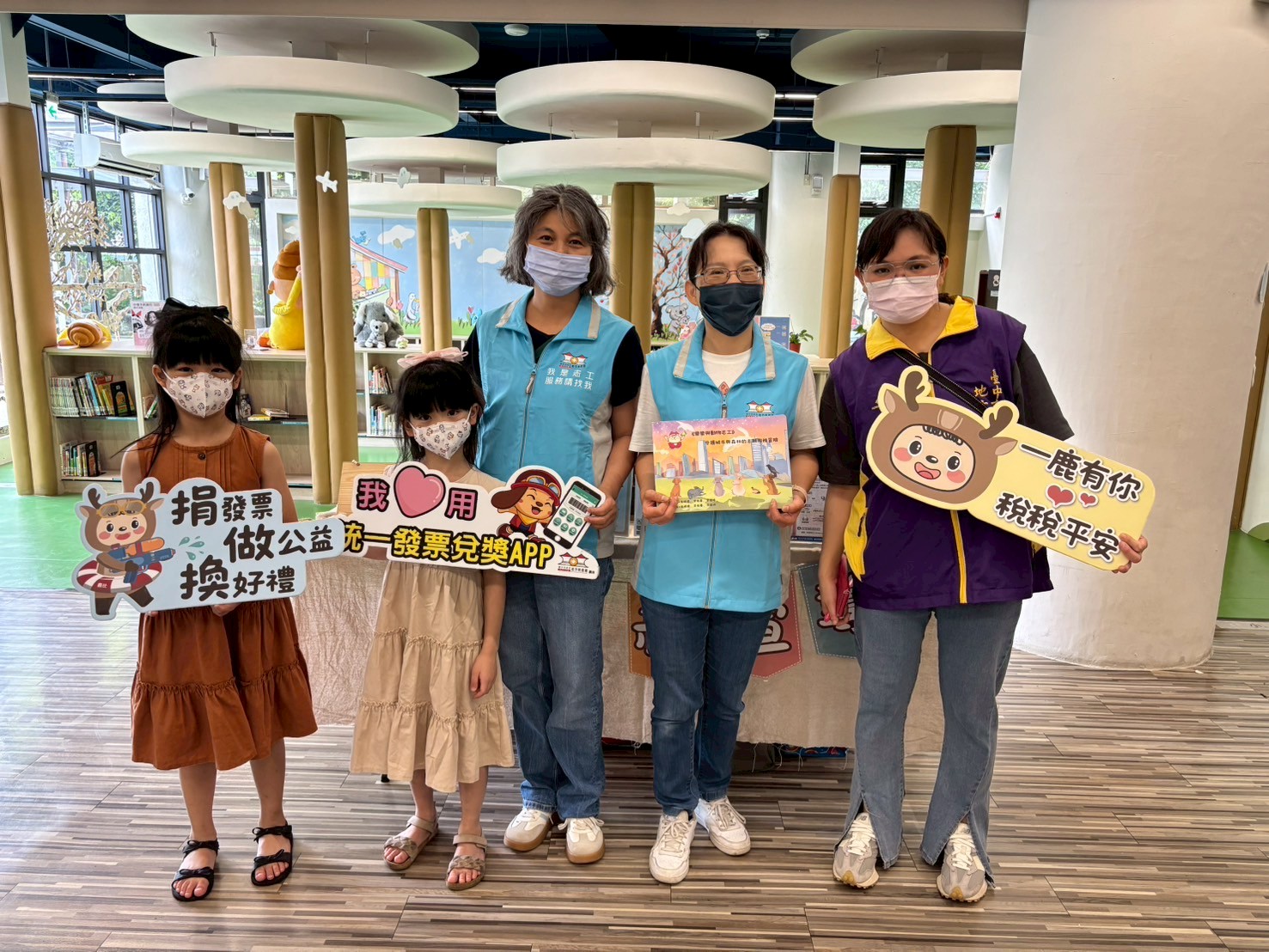 志工及宣導同仁向民眾與學童介紹「守護城市與森林的志願服務冒險」繪本,鼓勵大眾參與志願服務及消費索取雲端發票。