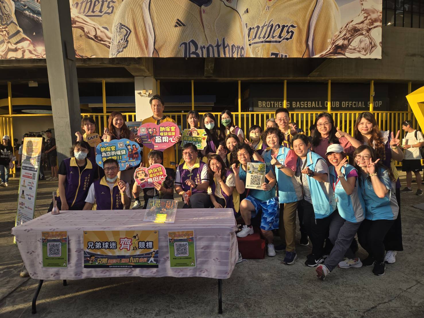 「兄弟球迷齊競標」競標活動圓滿完成,工作人員與周思齊學長拍下大合照,並手持納保官手牌向現場民眾宣導。