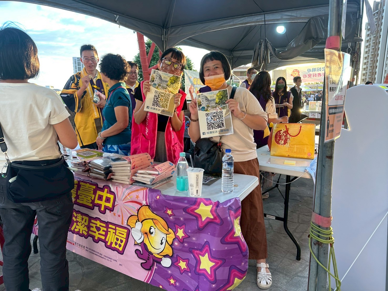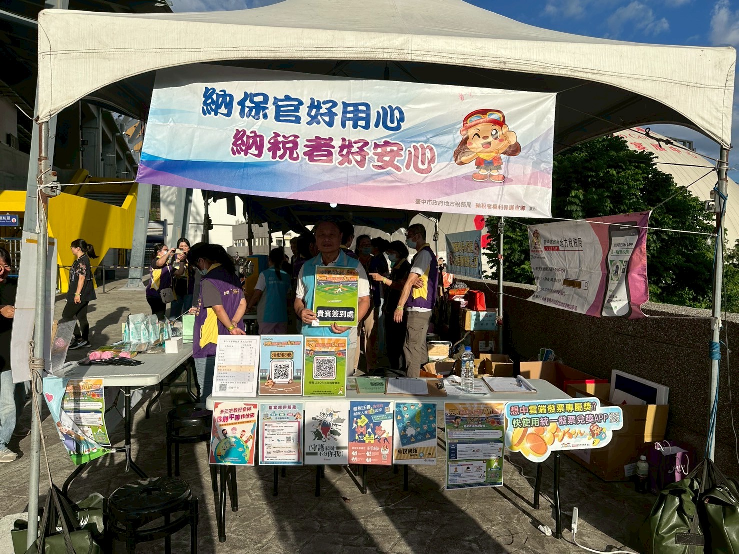於活動攤位懸掛納保布條,張貼性別平等、全民國防等文宣,擴大宣傳效益。張貼統一載具手板鼓勵大家使用載具減少紙張發票印製,一起為環保盡一份心力。
