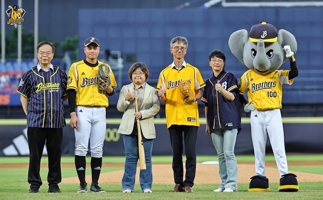 開球儀式圓滿成功,沈局長、球芽蕭理事長拉開棒球比賽序幕,與兩位主任、球員宋晟睿、吉祥物小翔開心的合影。