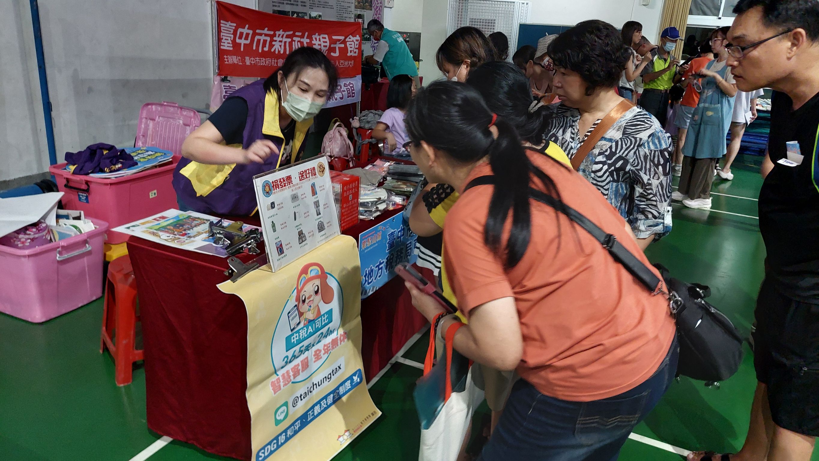 參訪的民眾在觀賞活動表演之餘,來到租稅宣導攤位下載實用的「統一發票兌獎APP」,並踴躍捐贈發票兌換精美實用的宣導品。
