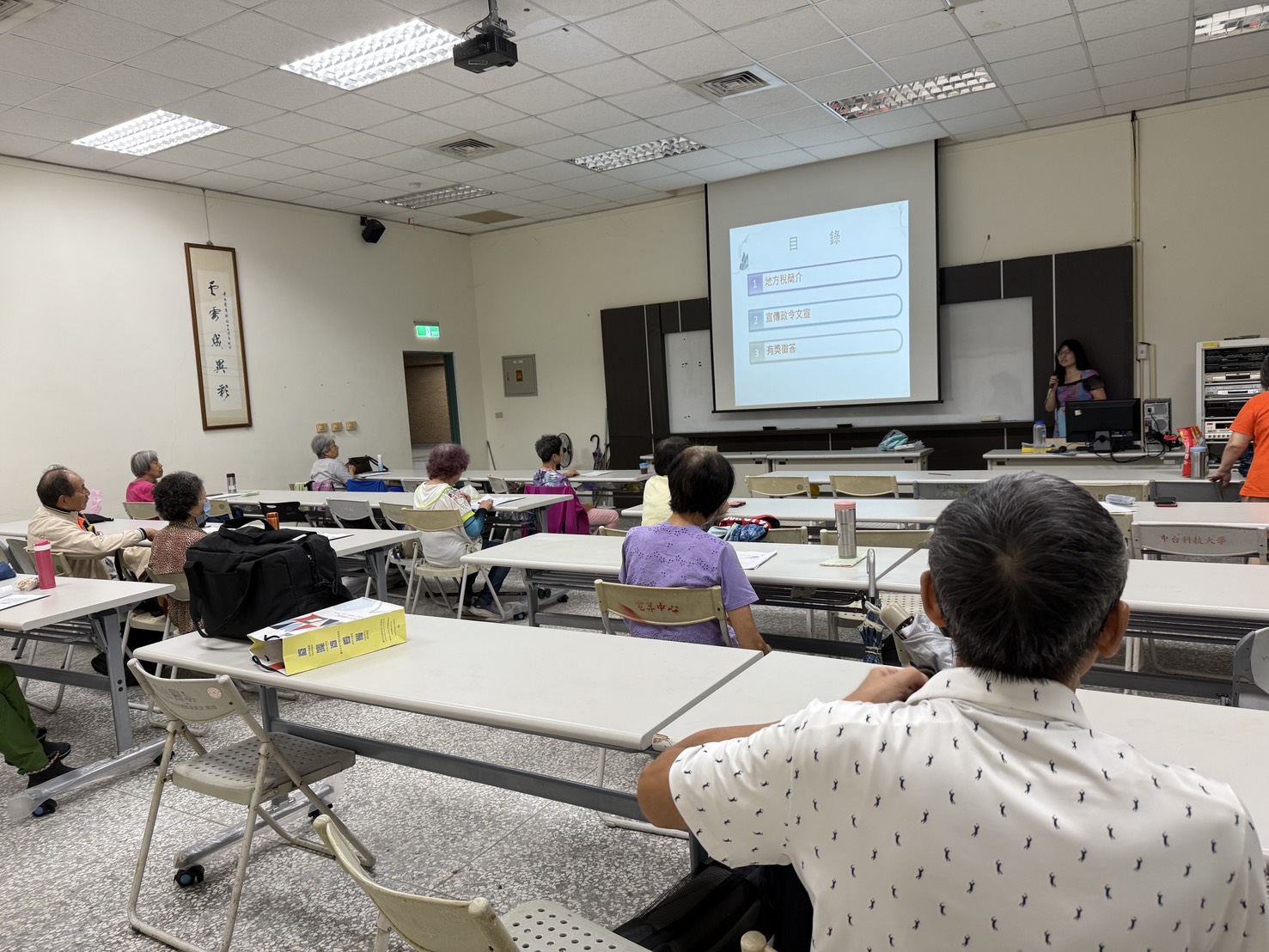 講師搭配紙本講義與投影幕,仔細地介紹地方稅。