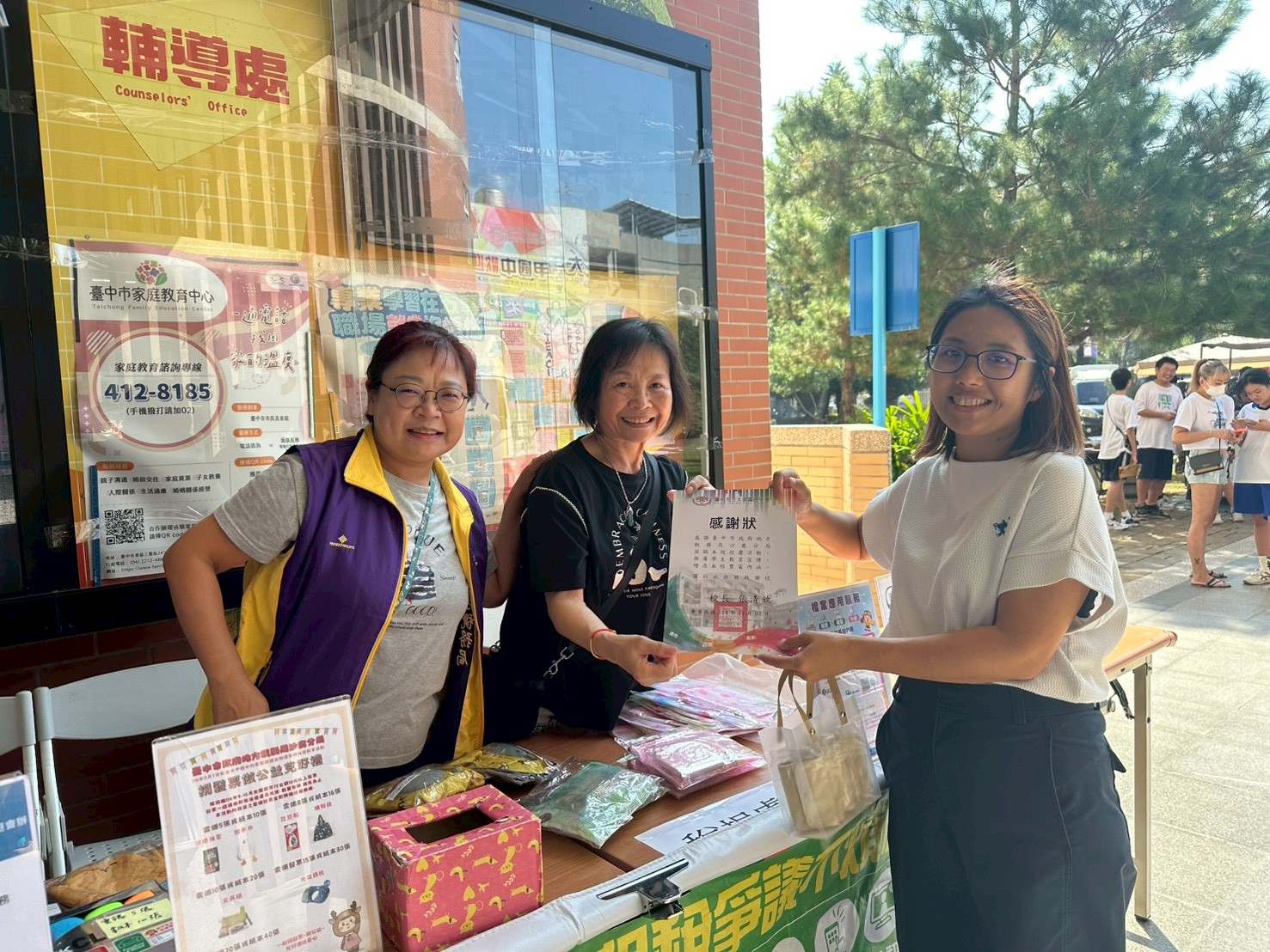 活動現場校方頒發感謝狀,並鼓勵大家一同捐發票換好禮送愛心做公益。