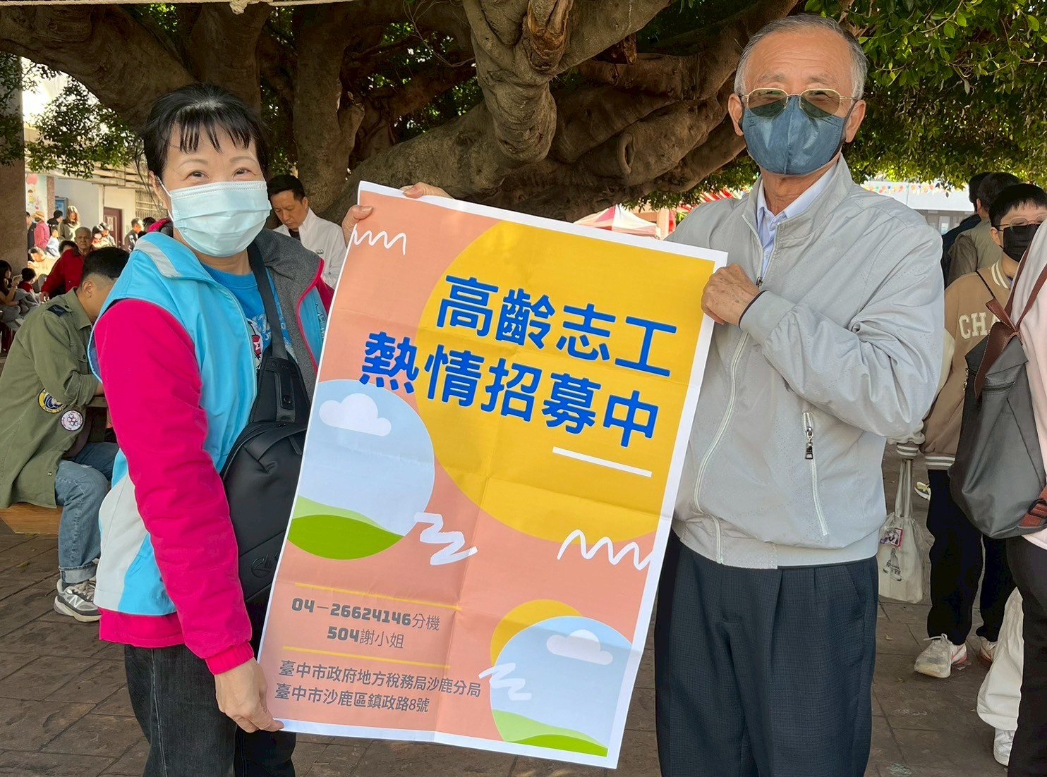 志工與現場高齡者合影,共同招募高齡志工,鼓勵大家參與志願服務,為社會盡一份心力。