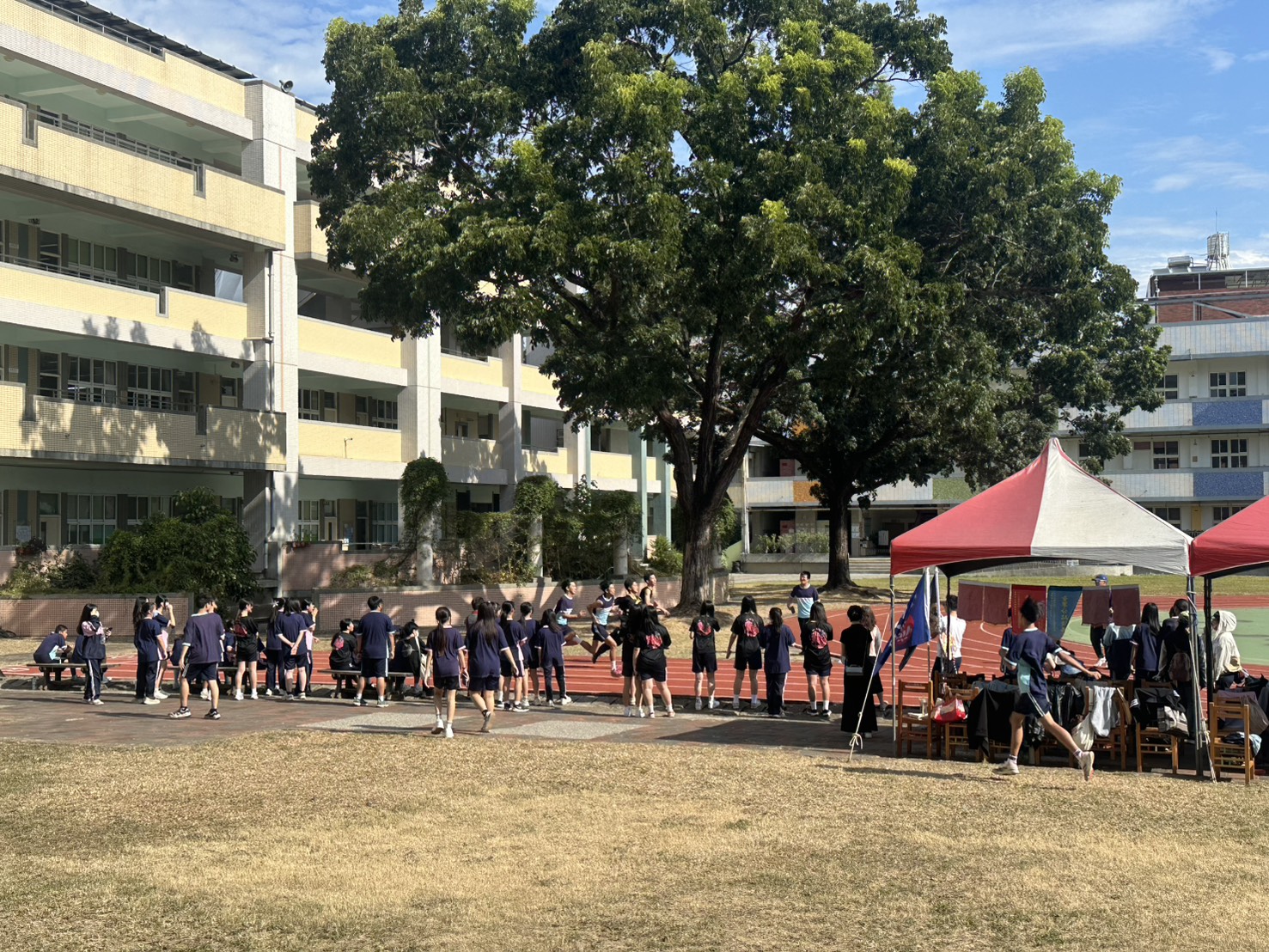校慶運動會操場聚集許多學生,準備接下來的大隊接力活動。