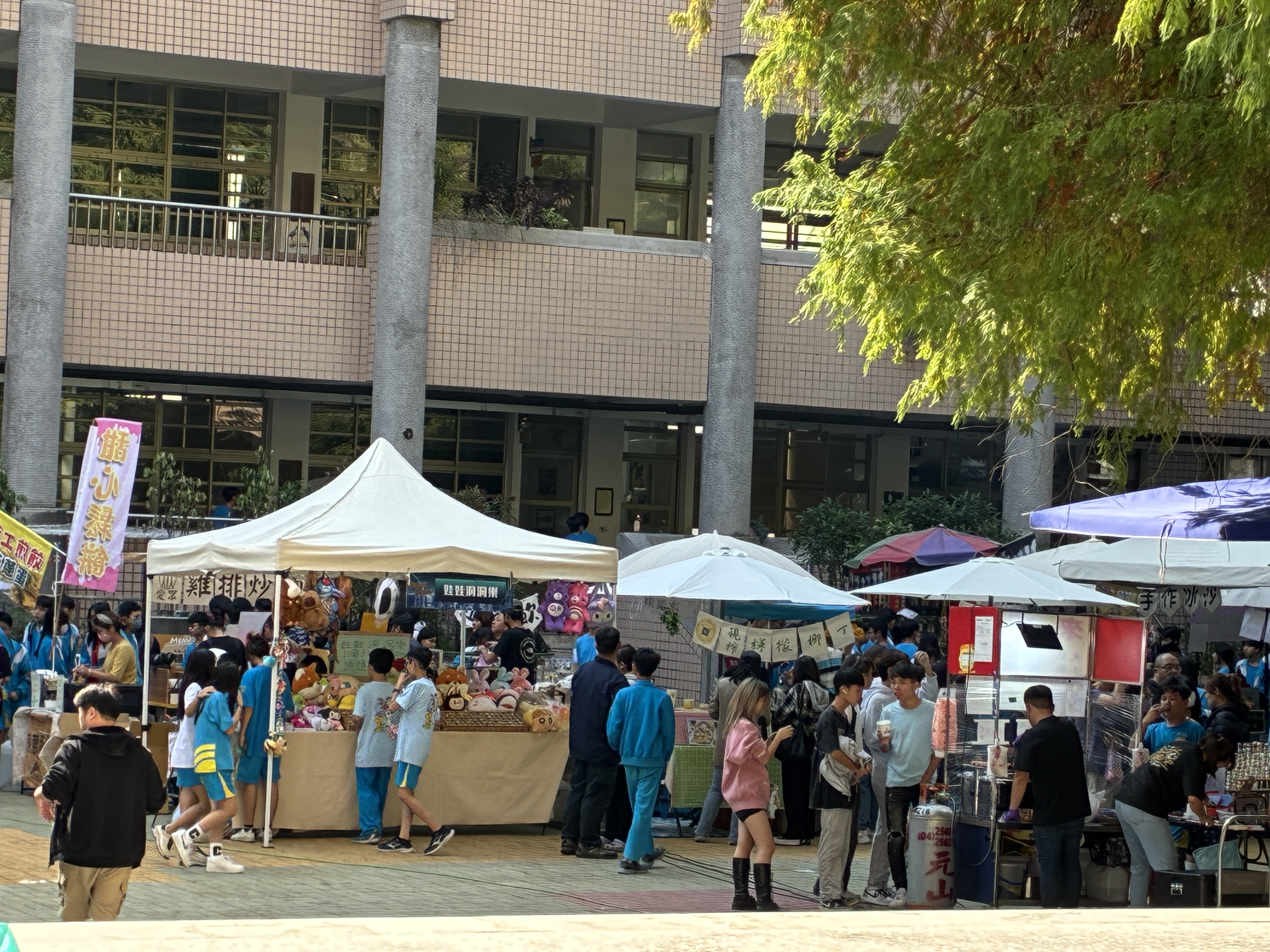 學校校慶舉辦園遊會活動,現場人山人海、熱鬧非凡。