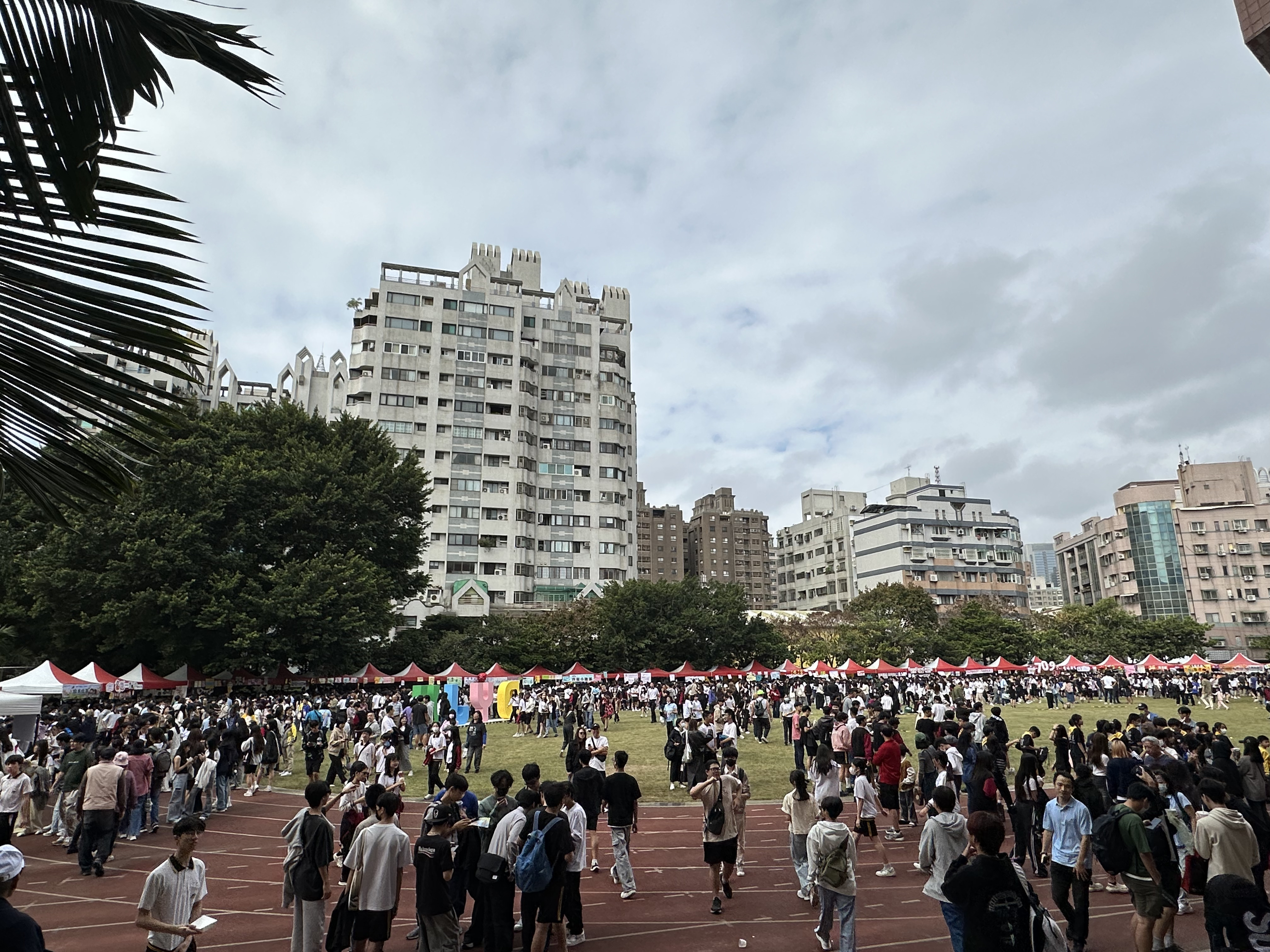 校園園遊會熱鬧登場,師生齊聚操場,攤位林立、人潮絡繹不絕,展現校園活力與歡樂氛圍。