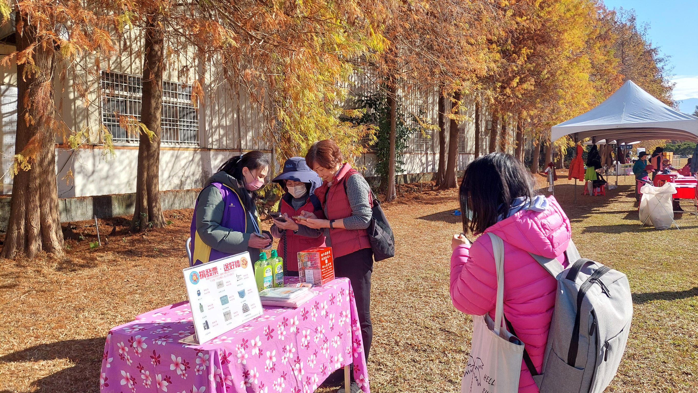 參加活動的遊客來到租稅宣導攤位,下載實用的「統一發票兌獎APP」,並踴躍捐贈發票兌換精美實用的宣導品。