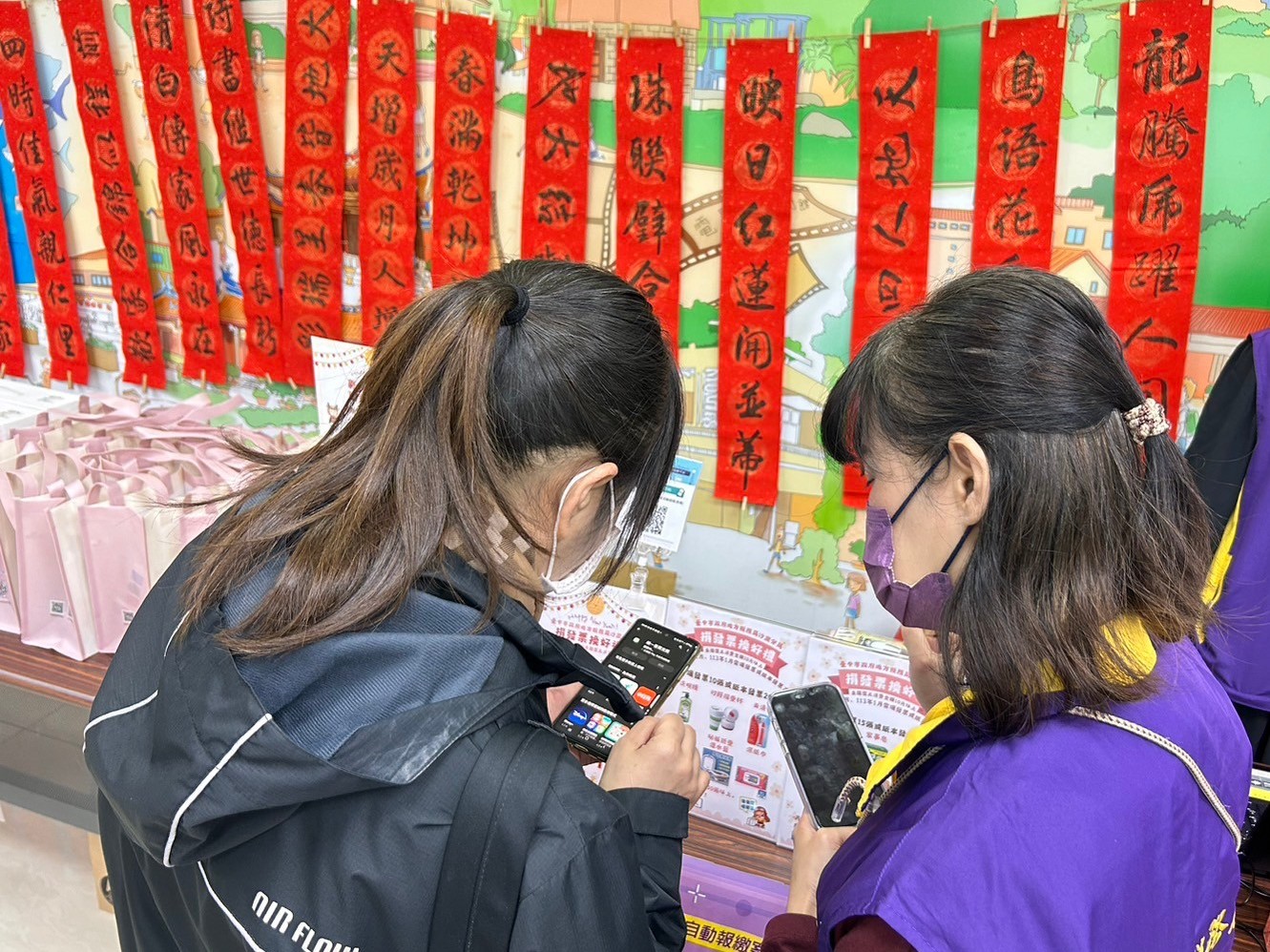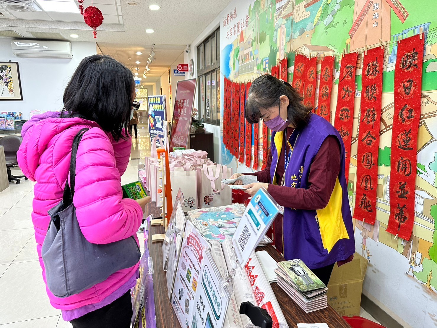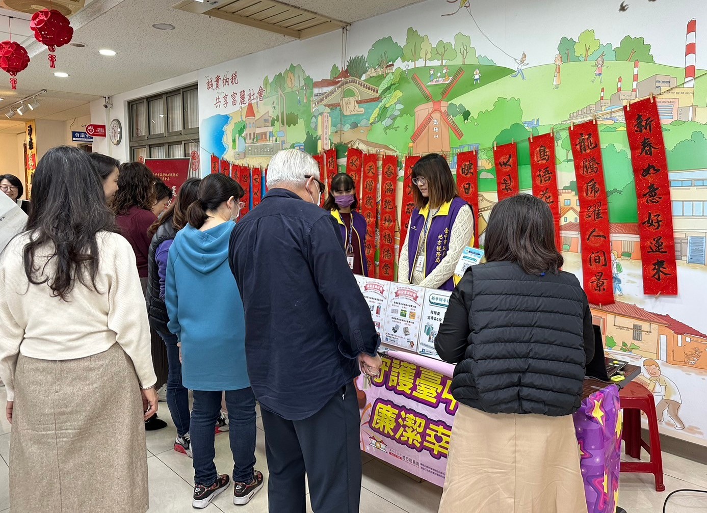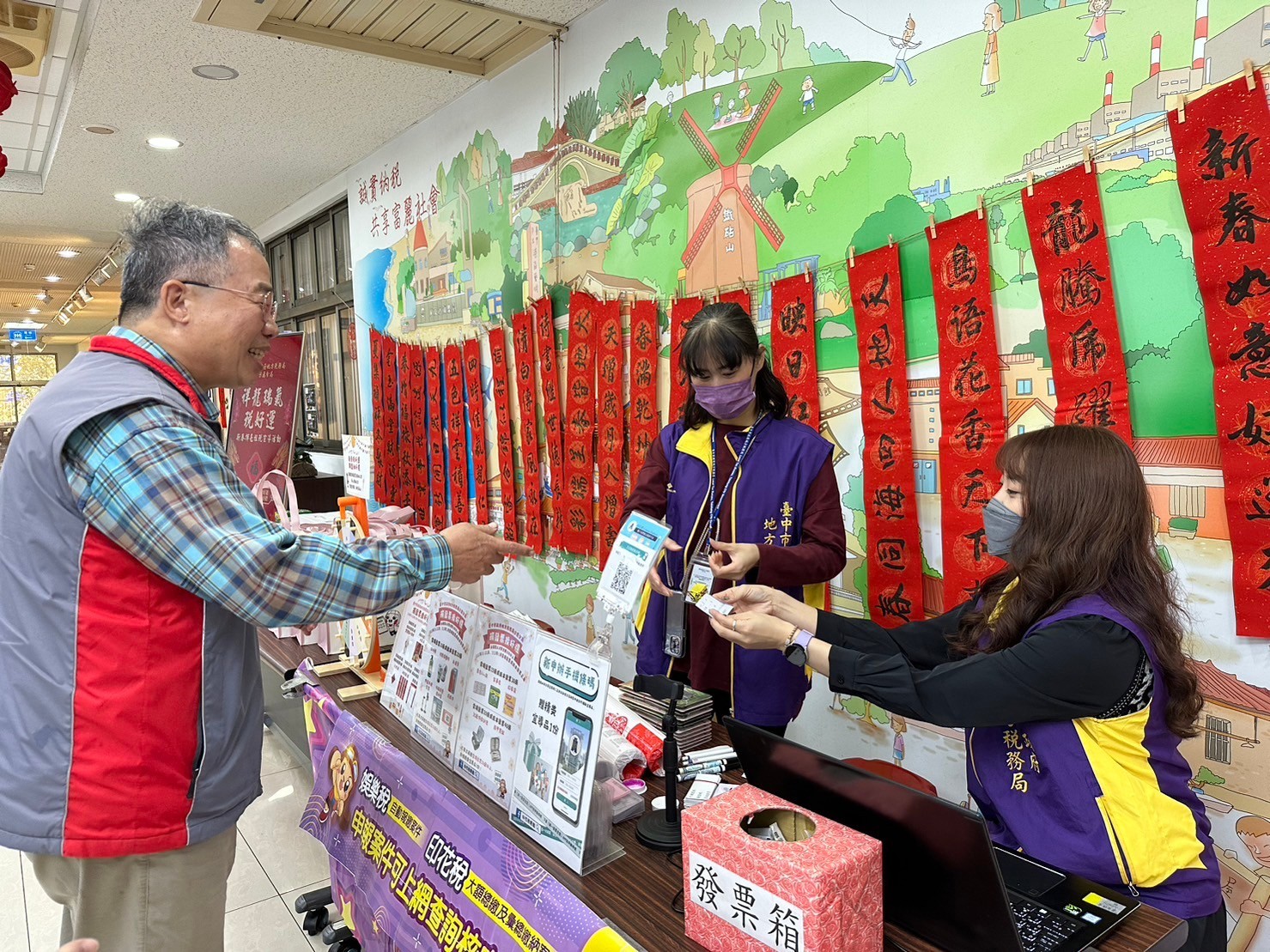 民眾回答租稅問題並捐贈發票兌換春聯及宣導品,分享喜氣之餘還能做愛心幫助社福團體。
