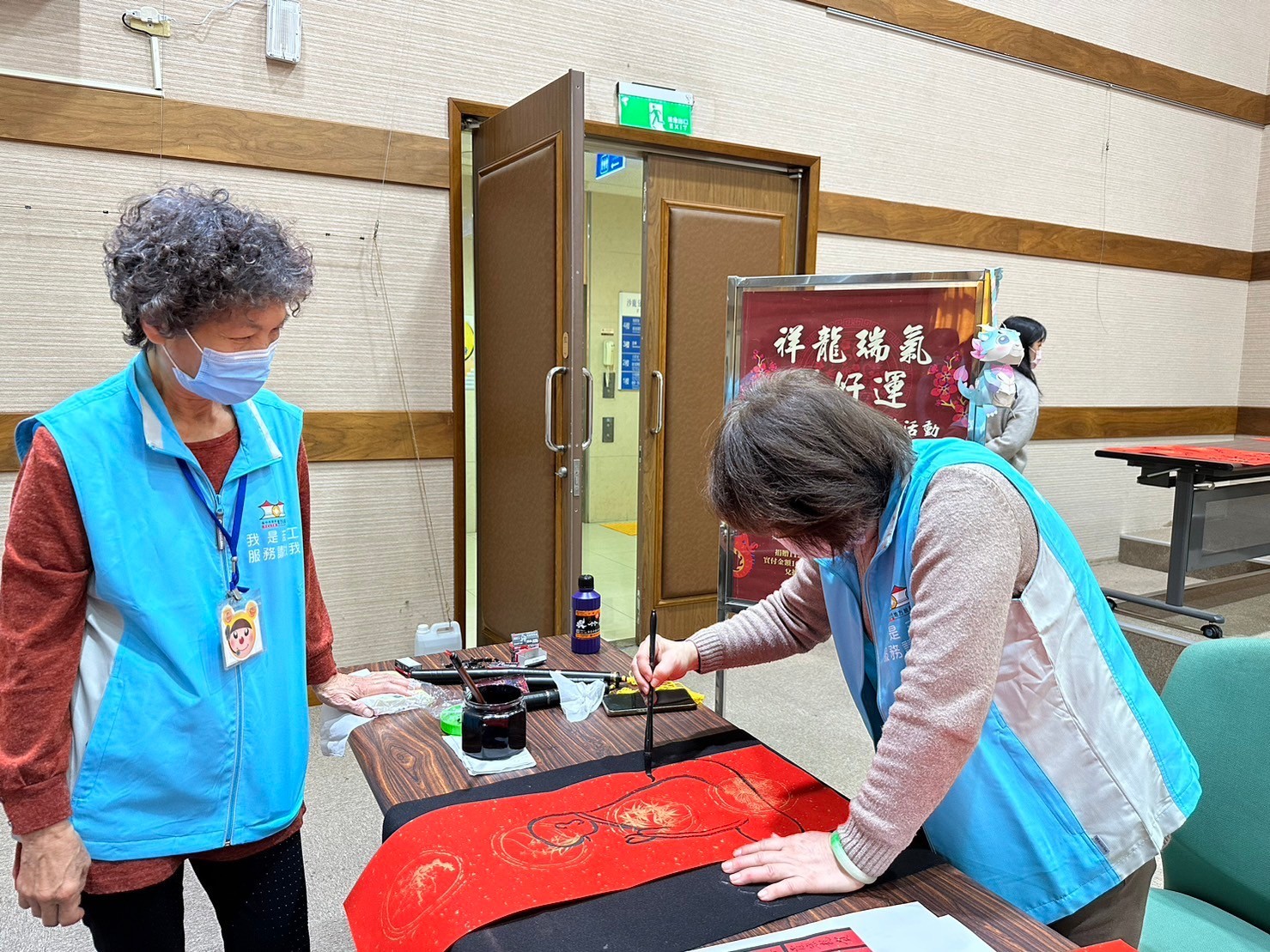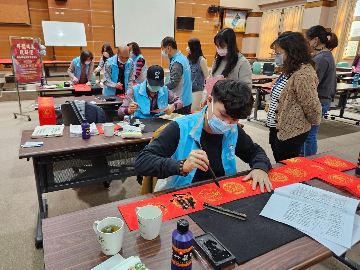 書法老師現場揮毫龍年春聯、四字聯、年畫及斗方,民眾踴躍捐贈發票兌換,洋溢過年喜氣。