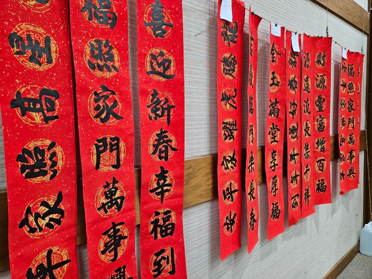 志工協助將寫好的春聯掛起風乾,讓民眾近距離觀賞書法揮毫文字之美。