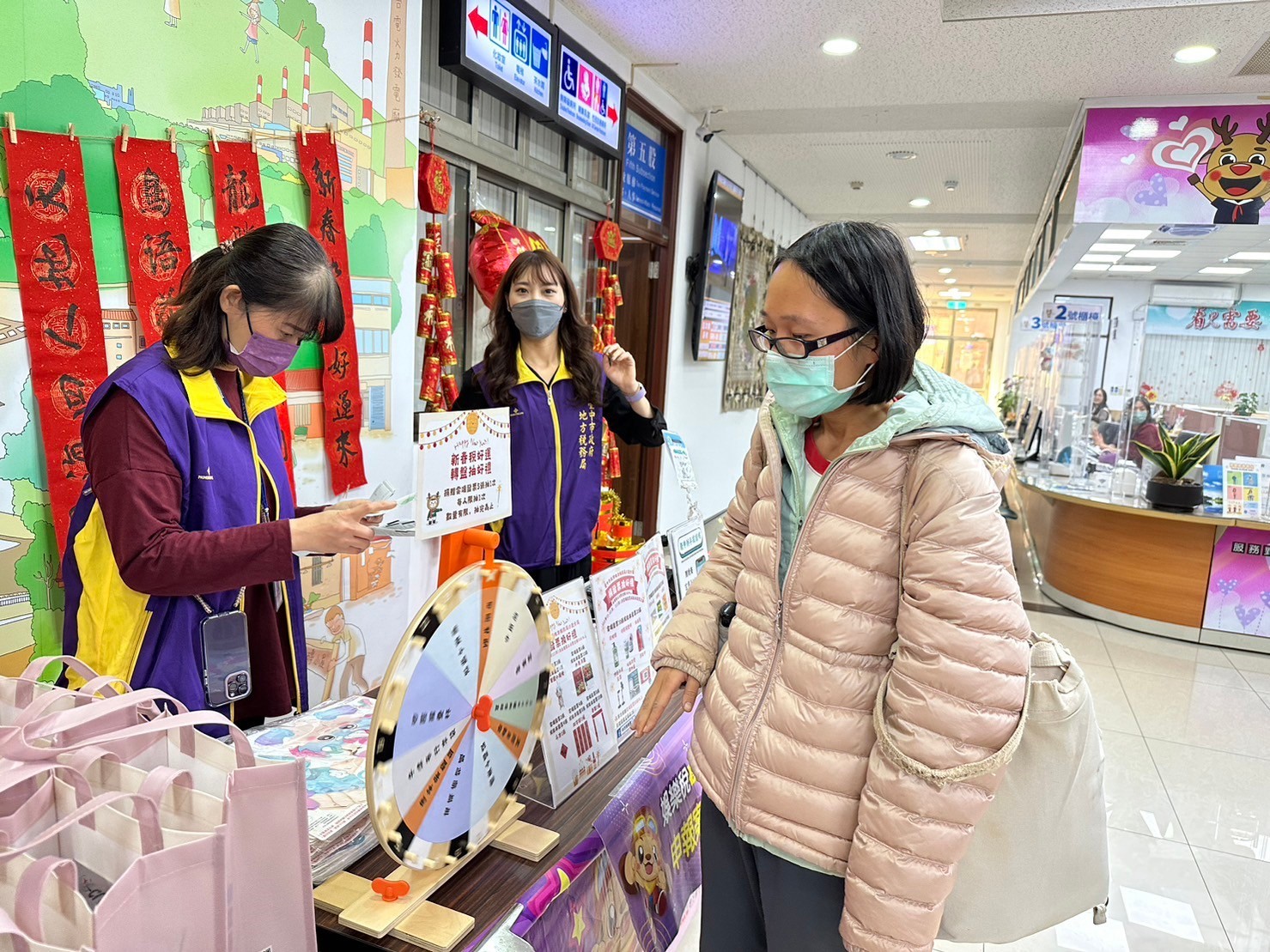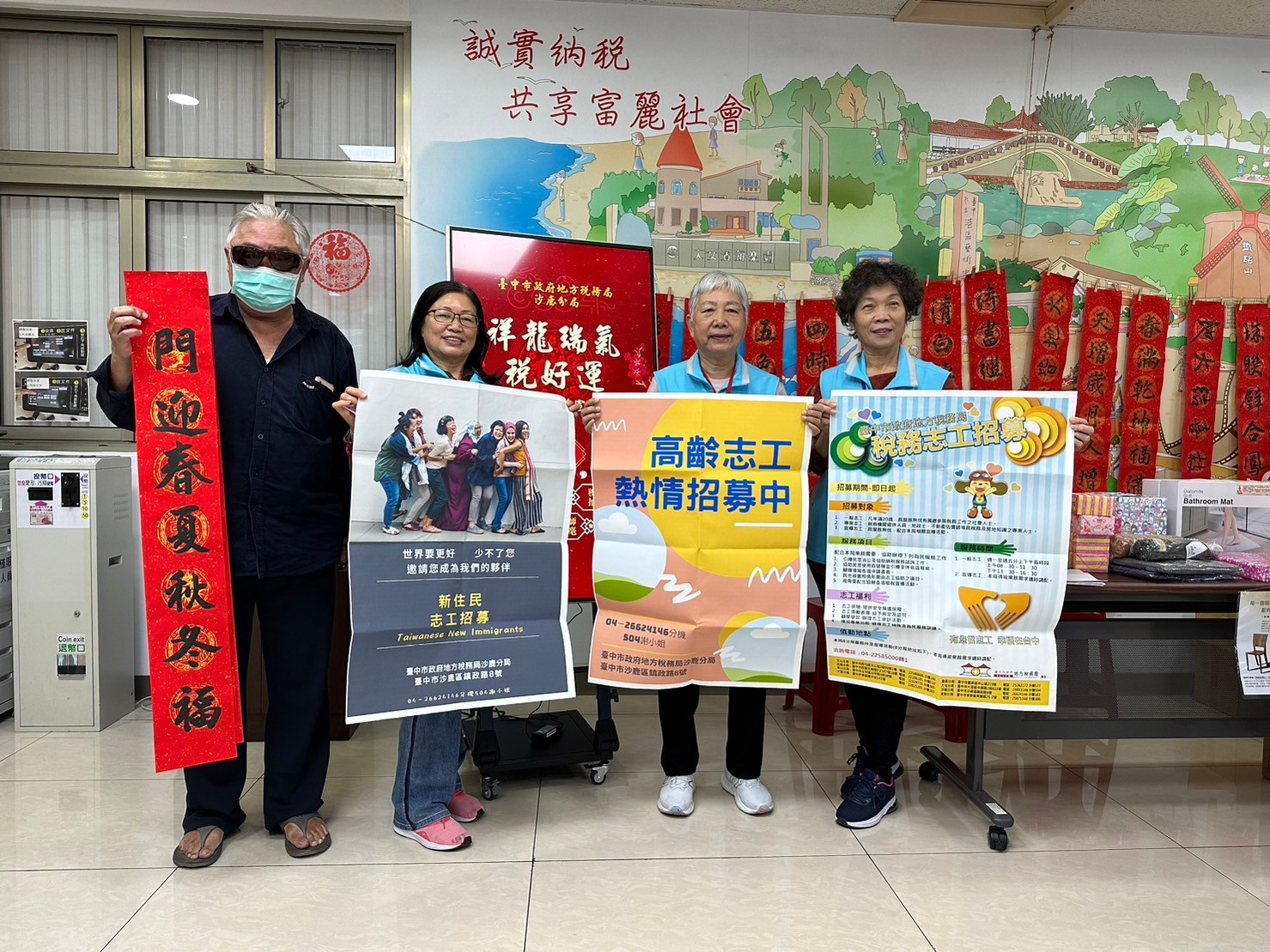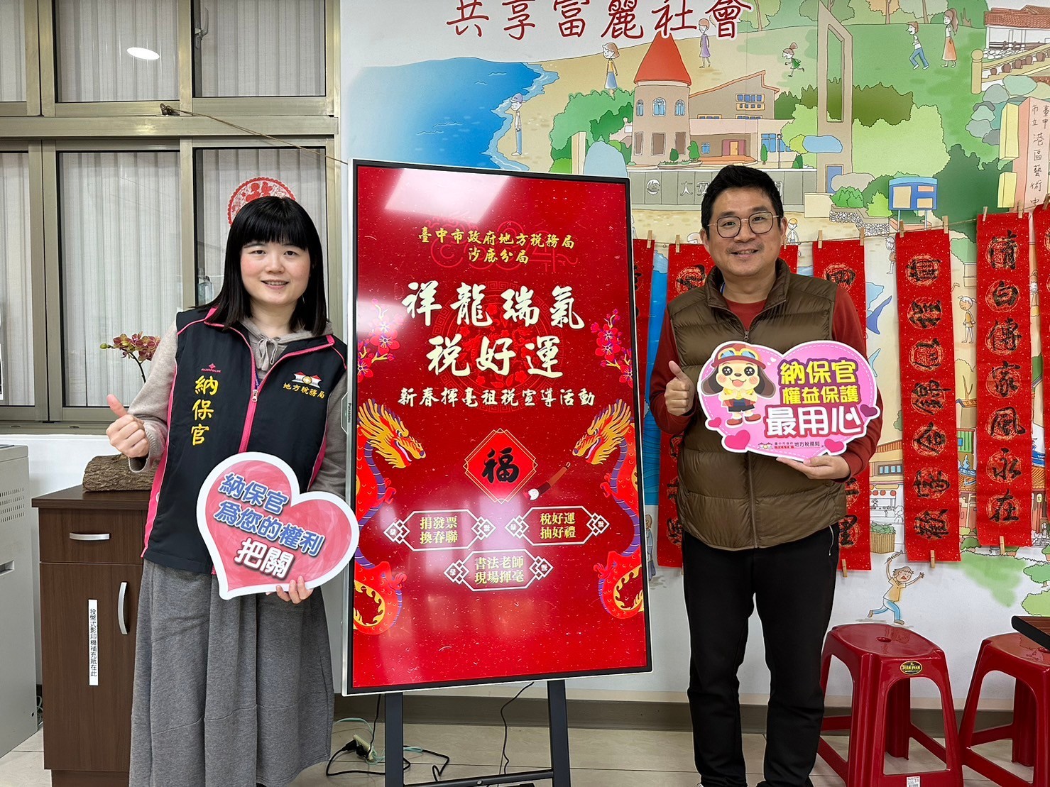 沙鹿分局辦理「祥龍瑞氣稅好運」新春揮毫租稅宣導活動,邀請民眾一同捐發票換春聯做愛心!