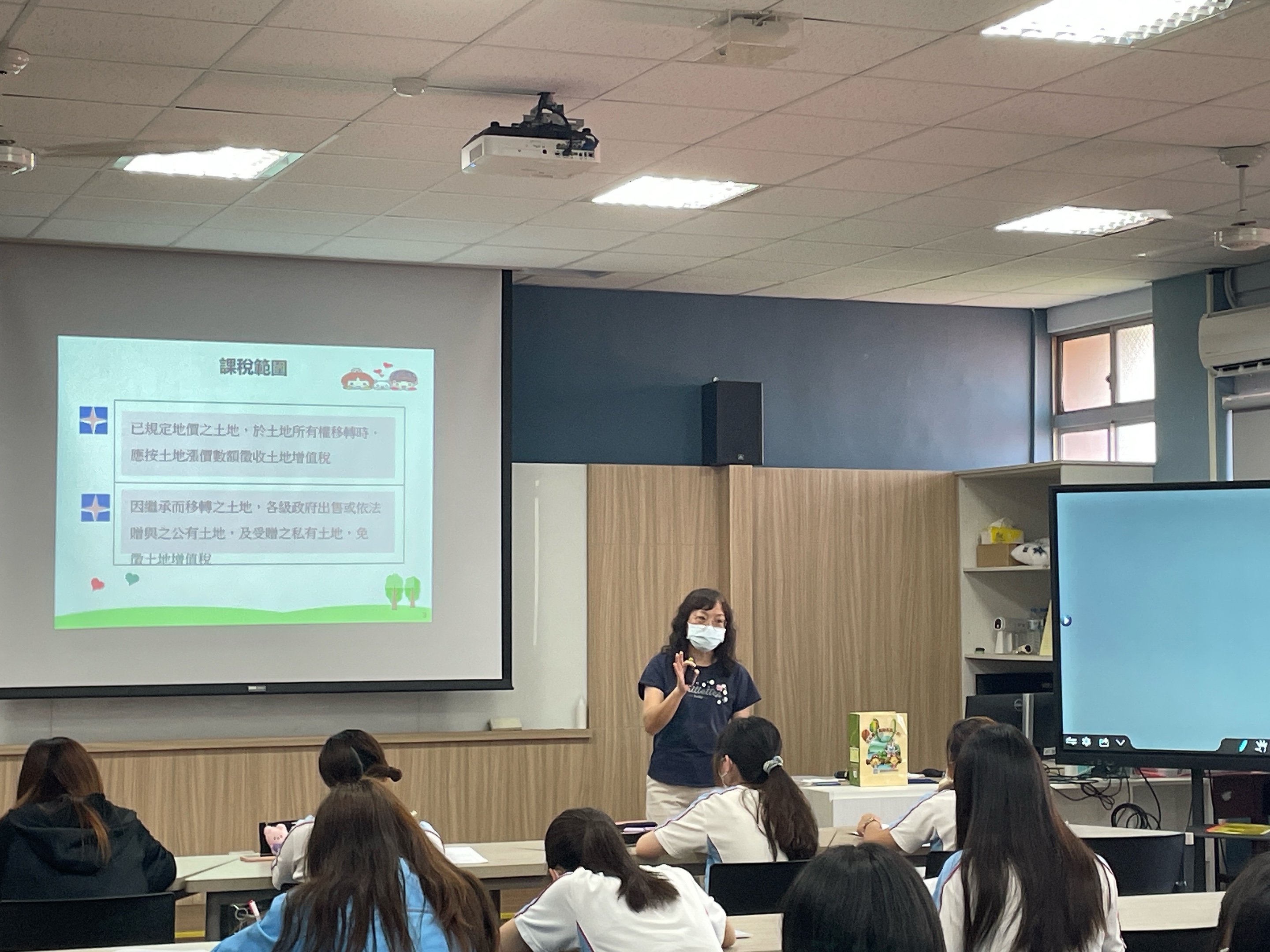 配合校方112學年度課綱「租稅探討與實作」課程,安排地價稅簡介,透過簡報、淺顯易懂的說明及實例介紹地價稅,幫助學生更易瞭解內涵。