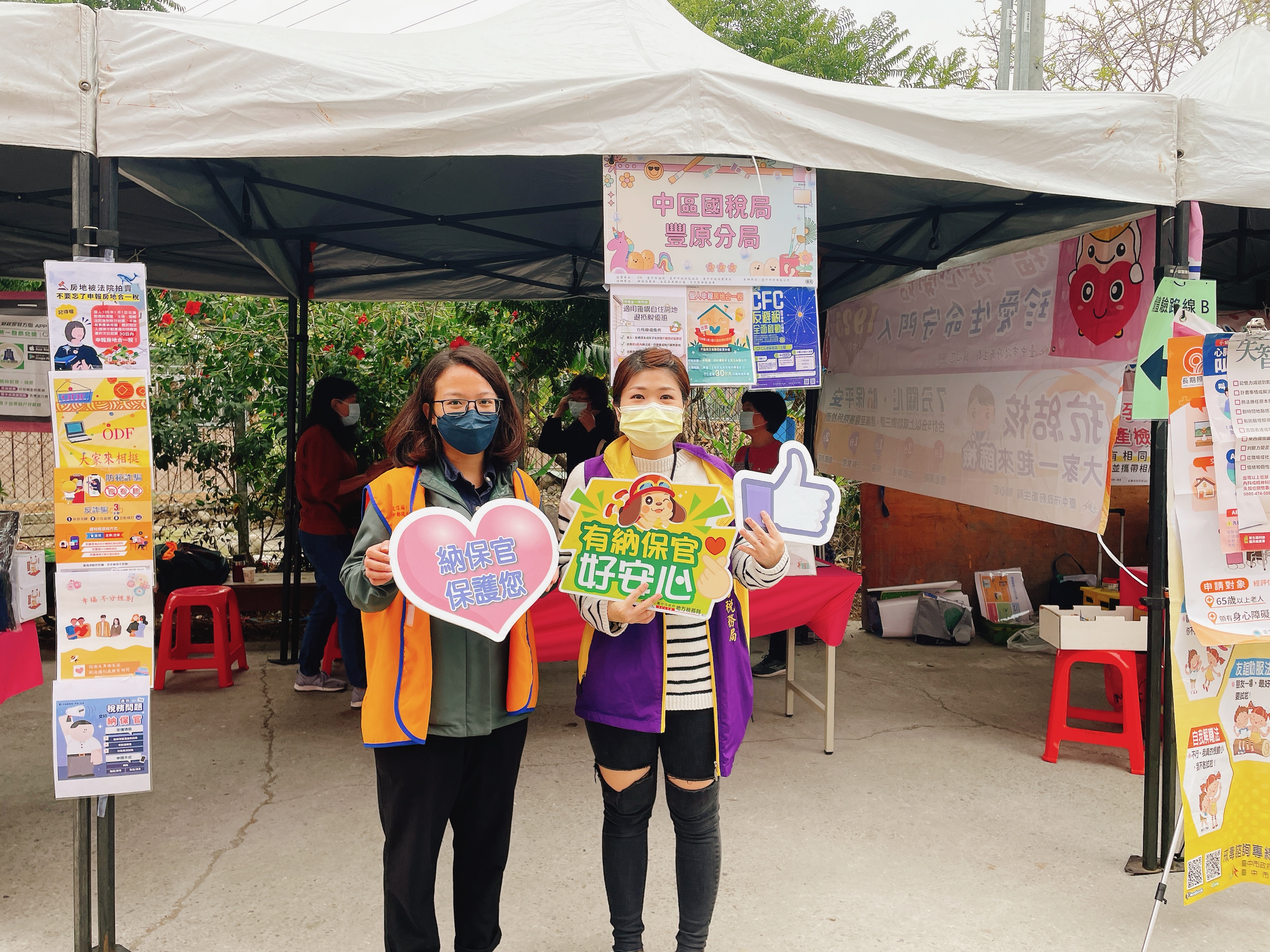 結合財政部中區國稅局豐原分局在該分局宣導攤位共同宣導~發票存雲端、下載使用「統一發票兌獎」APP及載具歸戶設定功能。
