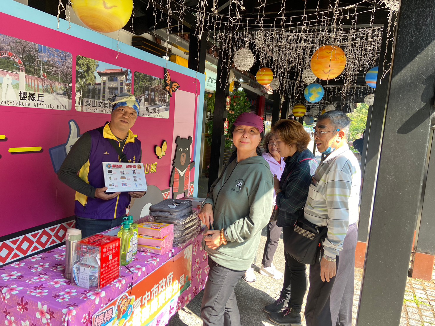 參訪的遊客在造訪梨山風景區之餘,來到租稅宣導攤位下載實用的「統一發票兌獎APP」,並踴躍捐贈發票兌換精美實用的宣導品。