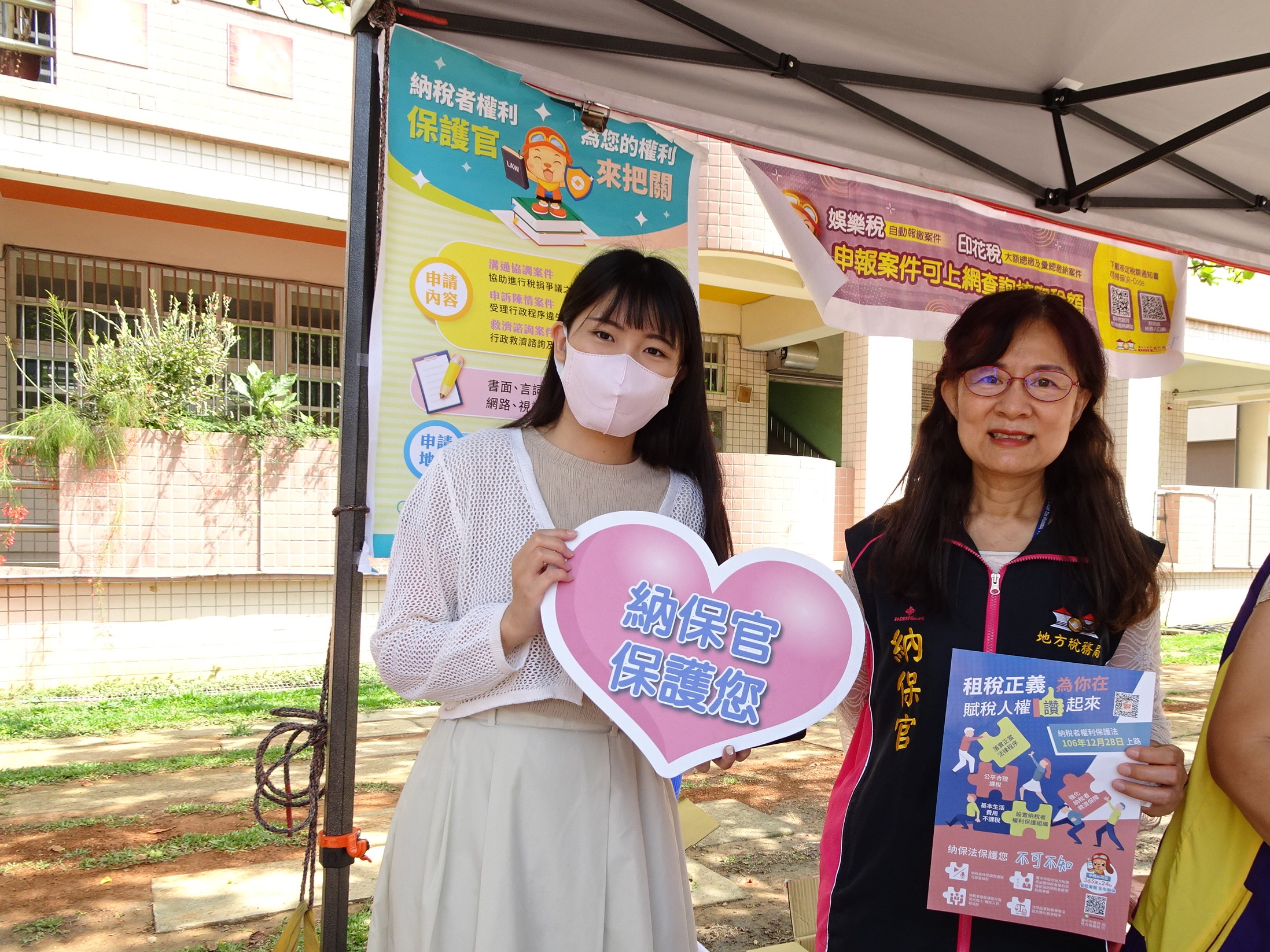 設置「納稅者權利保護諮詢」服務台,張貼海報宣傳納稅者權利保護法相關訊息,並由本局納保官親自在活動現場聆聽民眾的納保需求,提供即時服務。