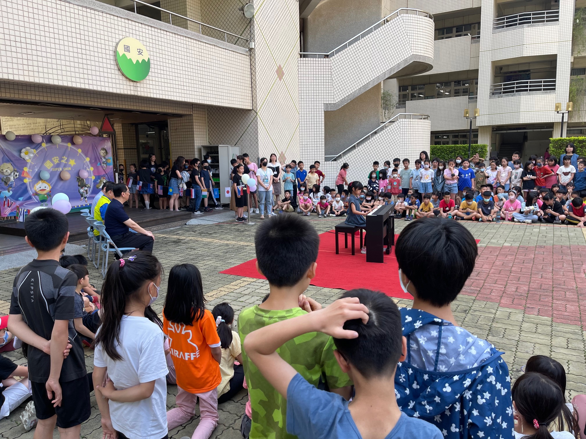 國安國小慶祝兒童節舉辦才藝表演賽,參與演出的同學正準備進場,文心分局受邀辦理租稅宣導活動,歡迎老師及同學們一起來攤位獻愛心換好禮。