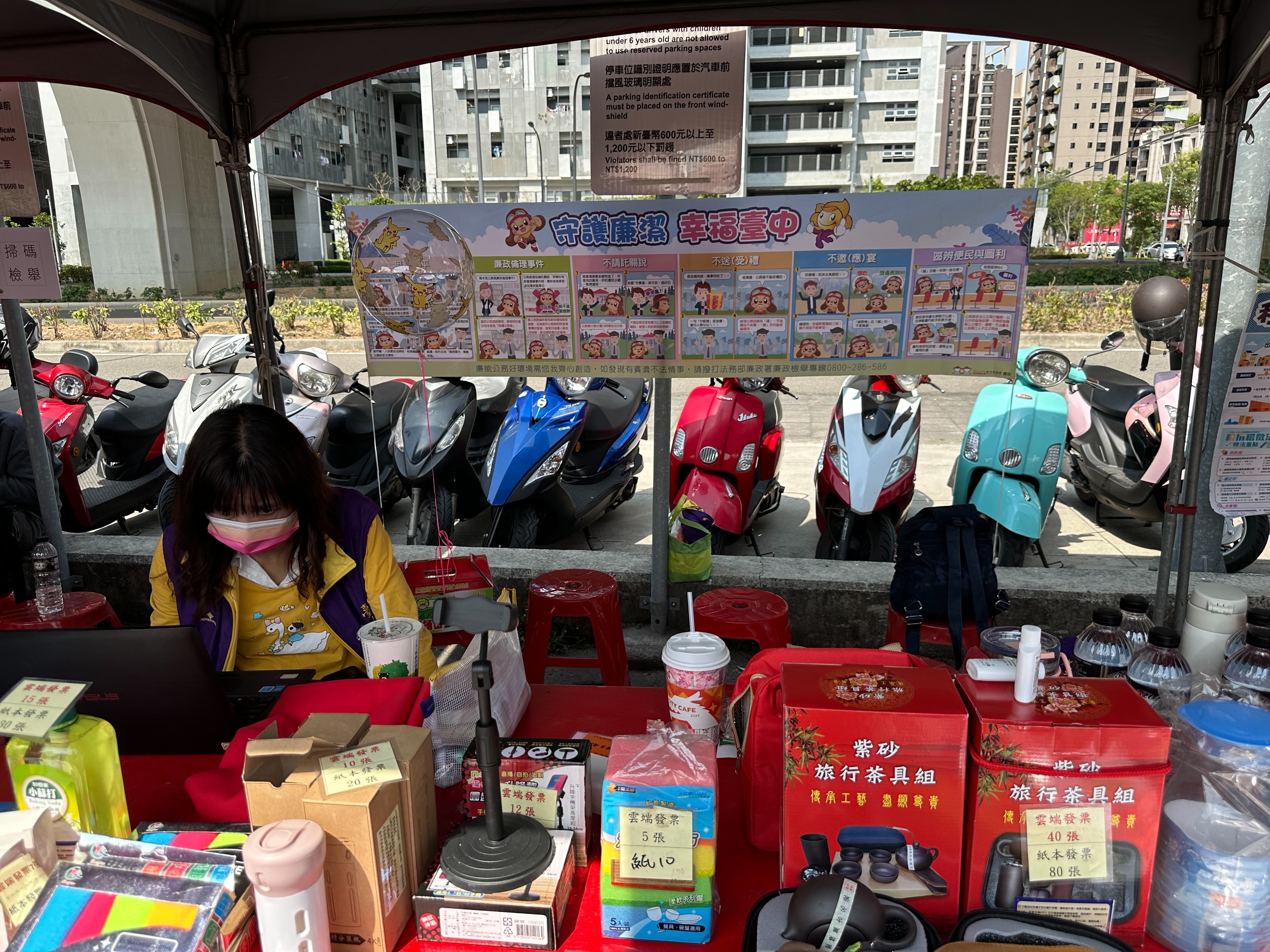 宣導品項豐富,民眾好奇駐足,工作人員趁機推廣「統一發票兌獎APP」,宣傳雲端發票專屬獎並完成領獎帳戶及載具歸戶設定。