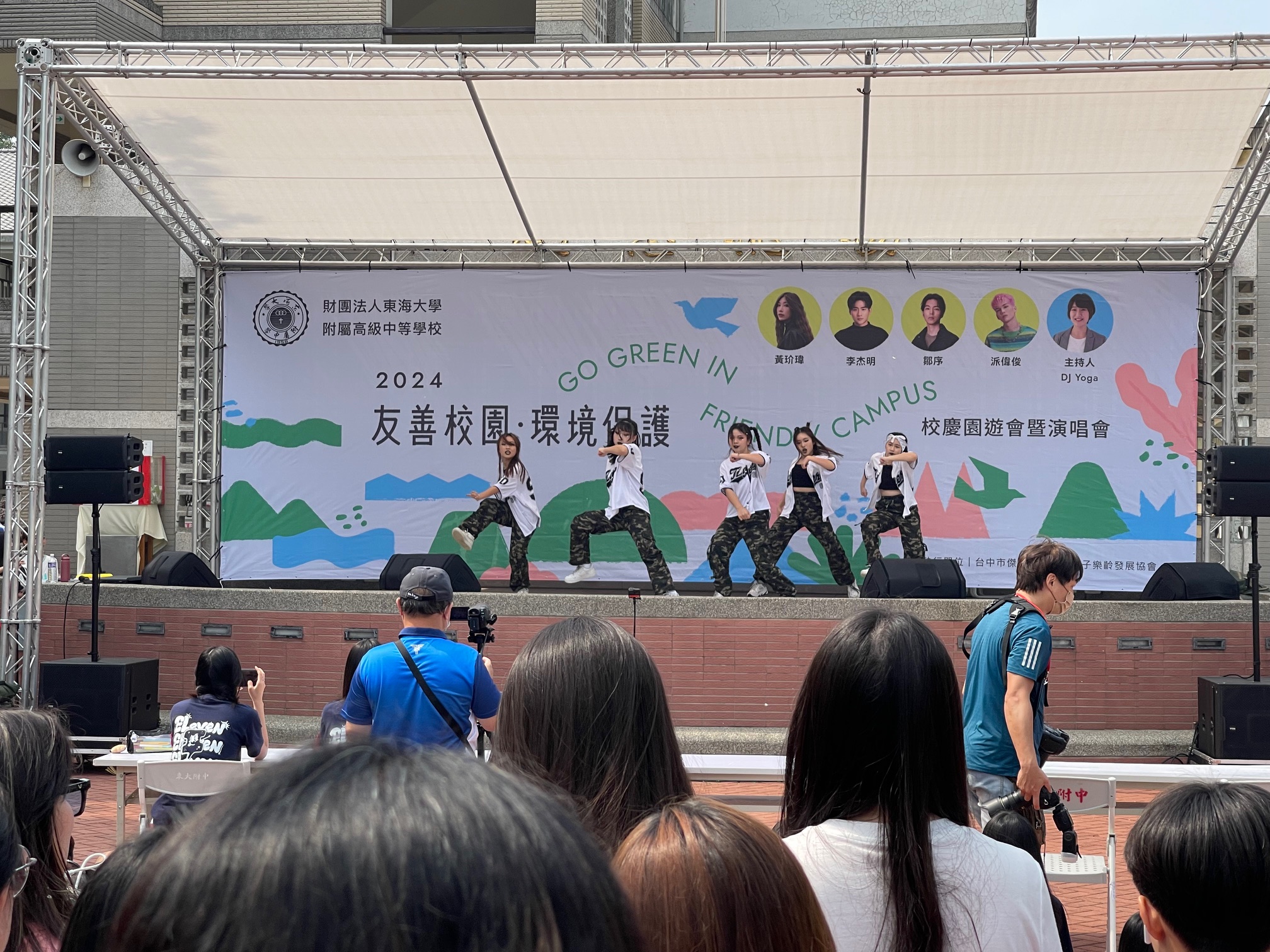 校慶舞蹈比賽決賽開始,同學們在台下熱情加油,表演者充分展現熱情、活力、動感,可見為了班級的榮譽,每個人都拚盡全力。