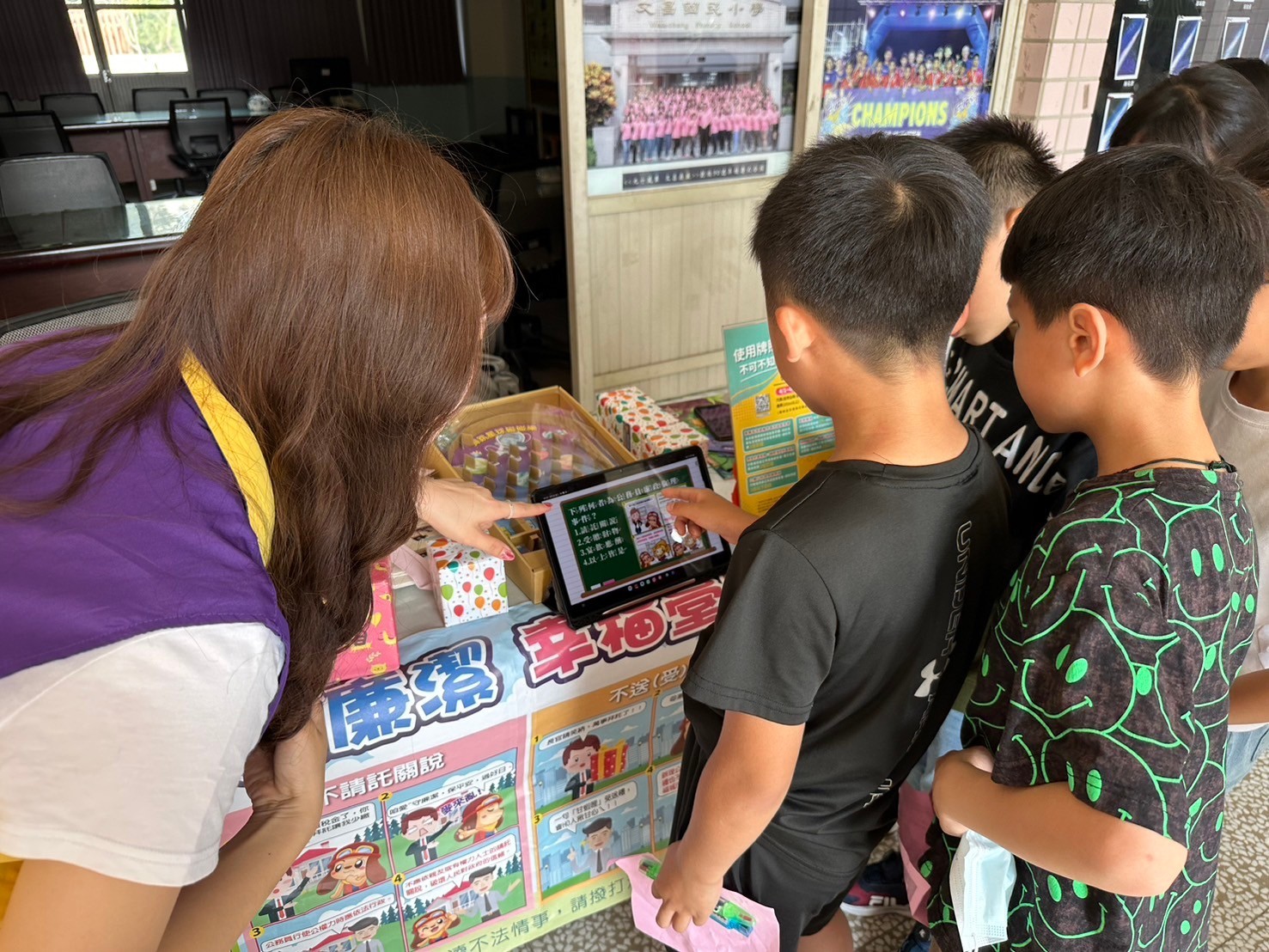 宣導同仁透過稅輕鬆漫畫向同學介紹廉政倫理事件並進行有獎徵答,向同學們強調守護廉潔的重要性。