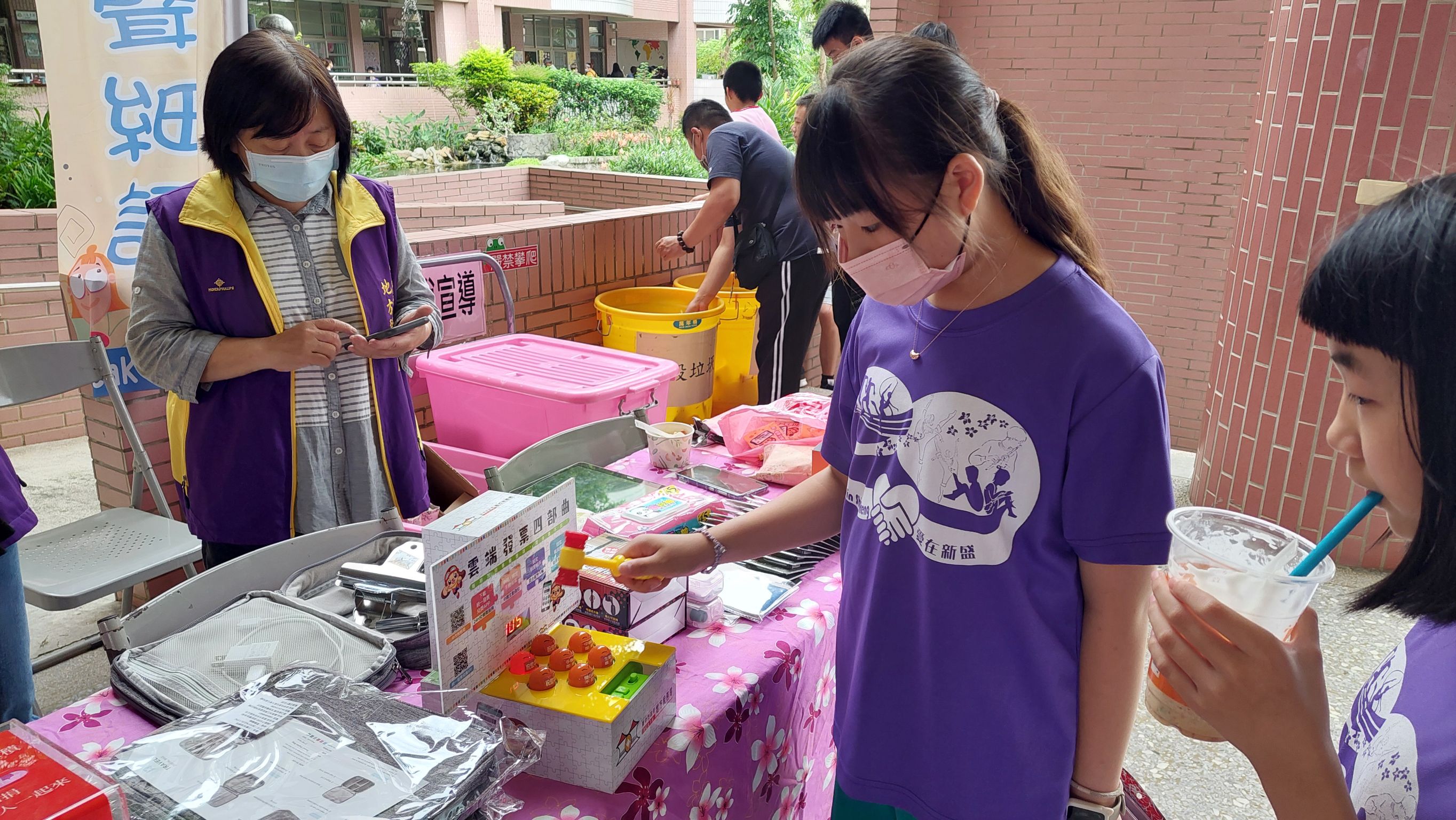 工作夥伴向學生及家長推廣下載實用的「統一發票兌獎APP」,並踴躍捐贈發票兌換精美實用的宣導品。