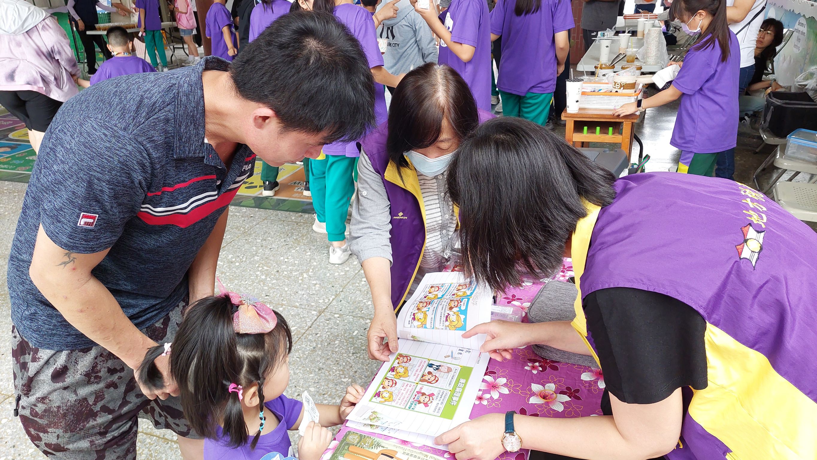 工作夥伴向新盛國小同學解說「稅輕鬆漫畫集」,學習廉潔誠信!