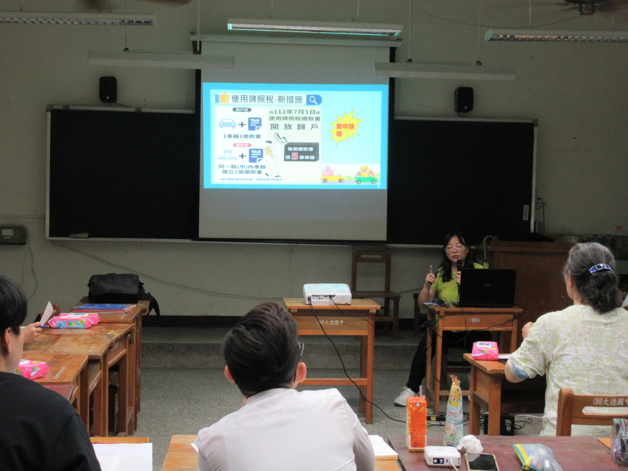 112年7月開始實施使用牌照稅繳款書歸戶措施,向學員說明及如果要申請歸戶,可至稅務局申請。
