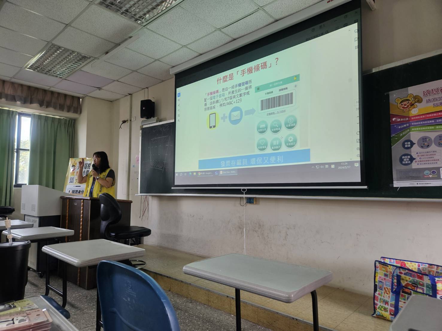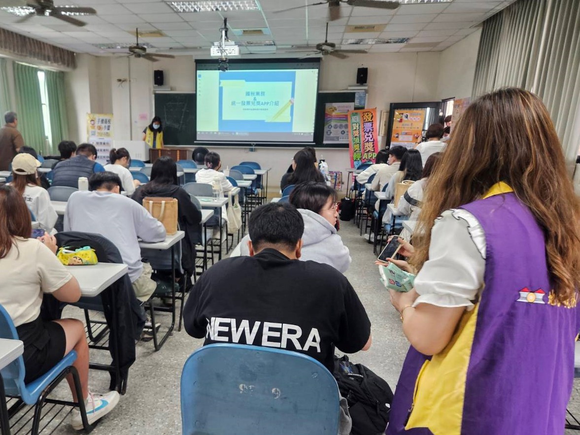 國稅局講師向同學介紹統一發票兌獎APP使用方式,也可以將悠遊卡、信用卡及會員卡等載具設定歸戶,增加使用雲端發票黏著度。