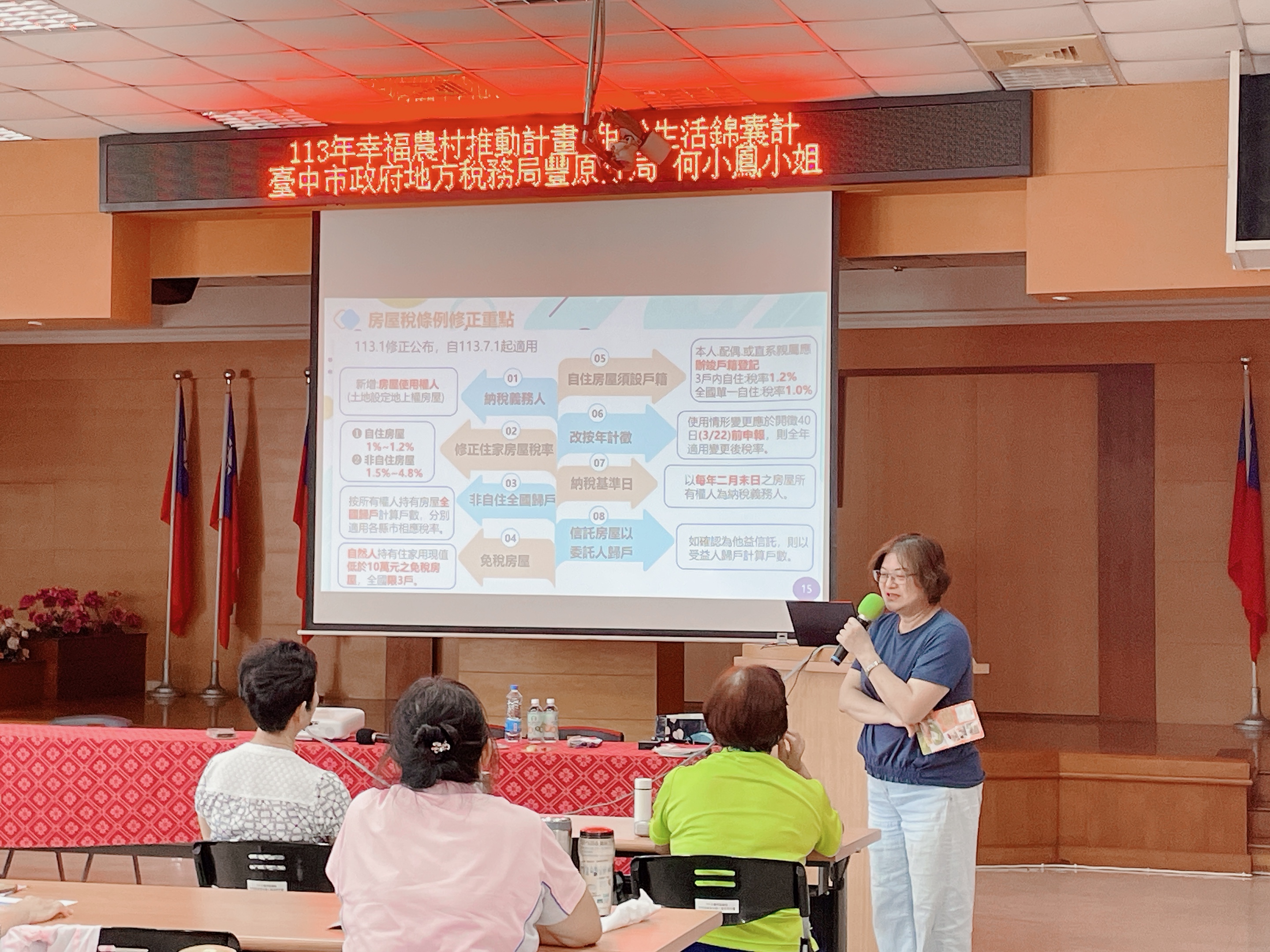 講師介紹113年7月1日起實施的房屋稅新制,並以淺顯易懂方式來說明,幫助學員更易瞭解內涵。