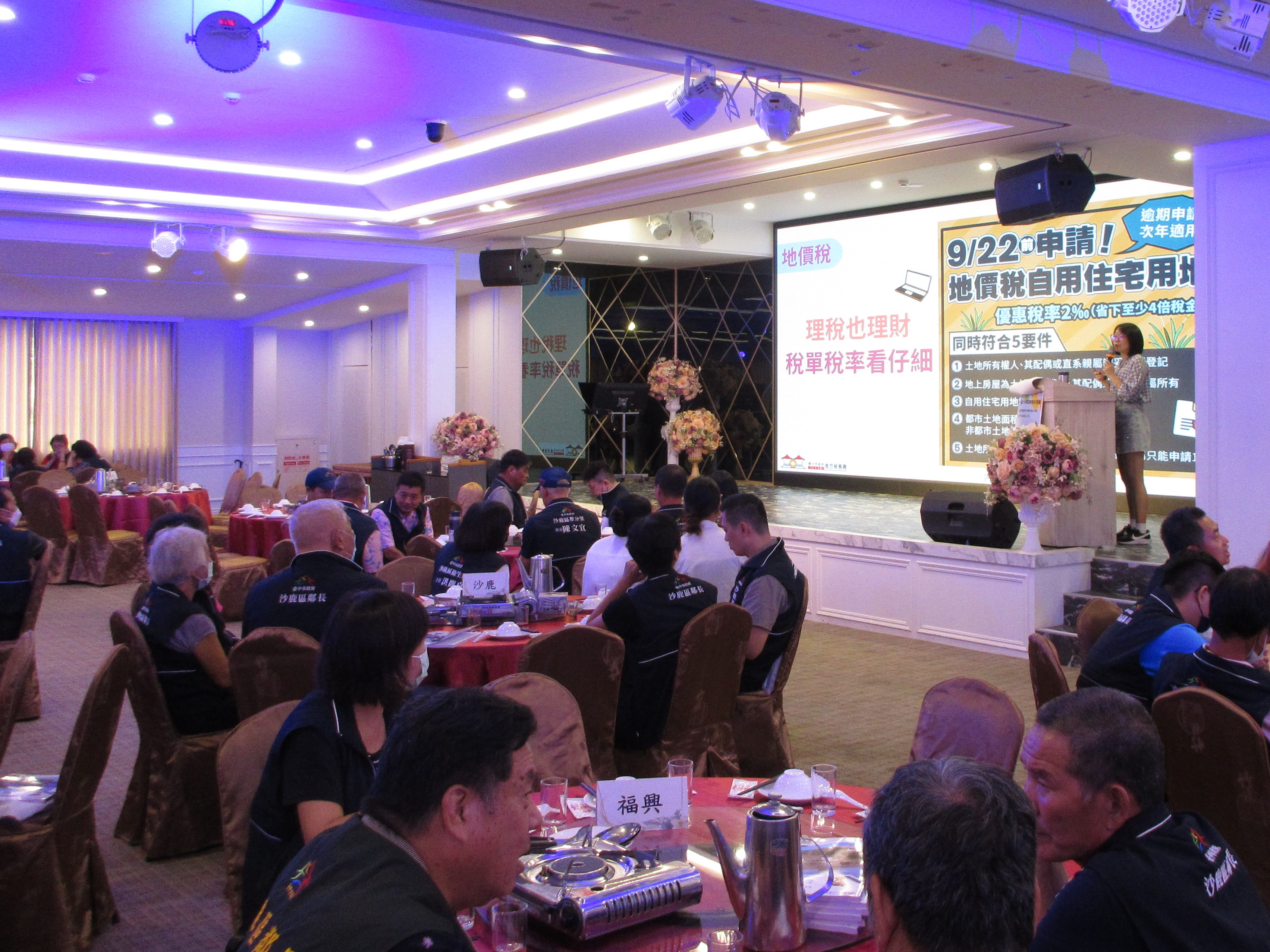 講師講解地價稅優惠稅率的要件及申請期限,請里鄰長協助向里民宣導。