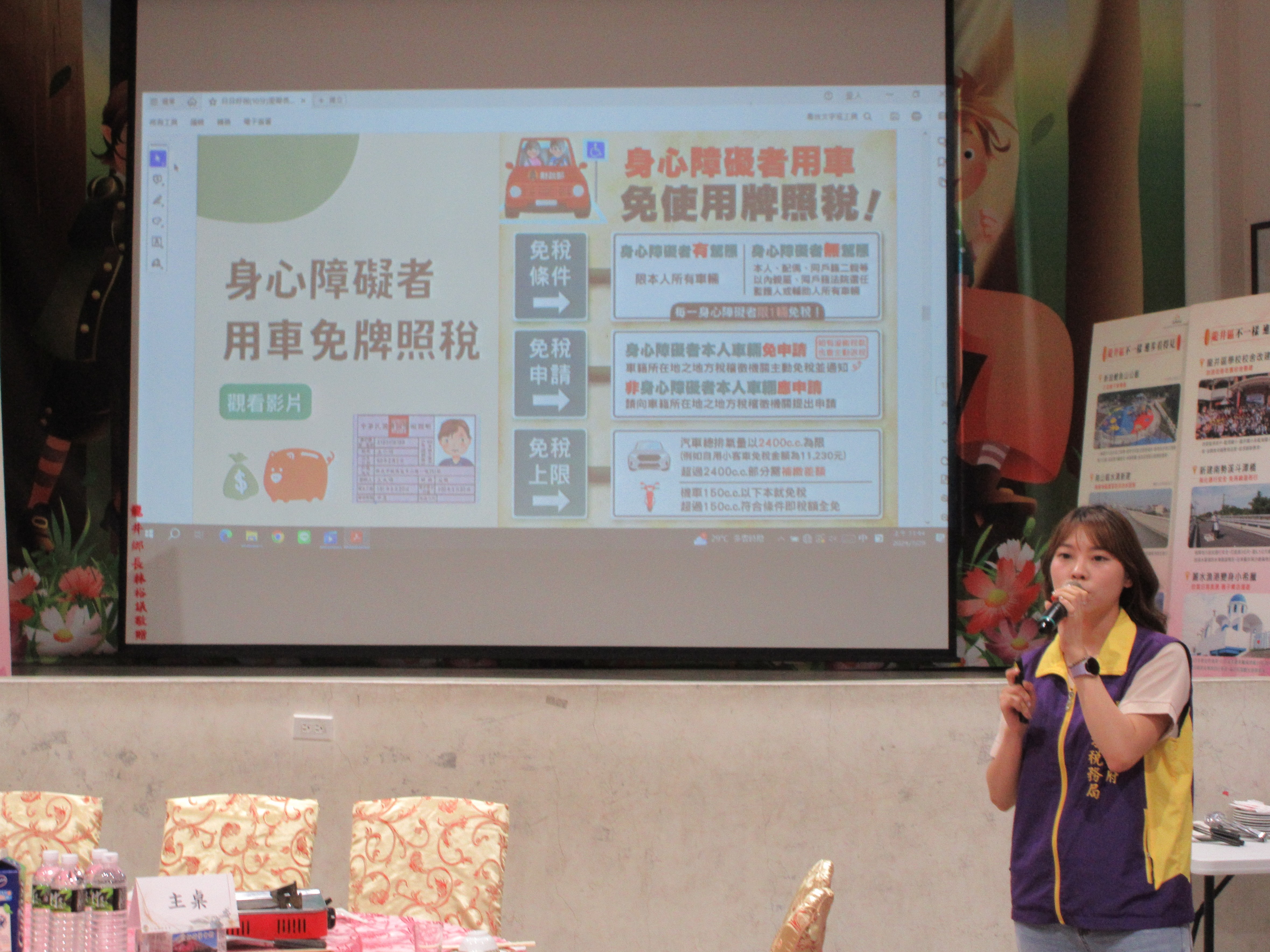講師為里鄰長解說節稅要點,詳細說明使用牌照稅減免條件、範圍及如何申請。