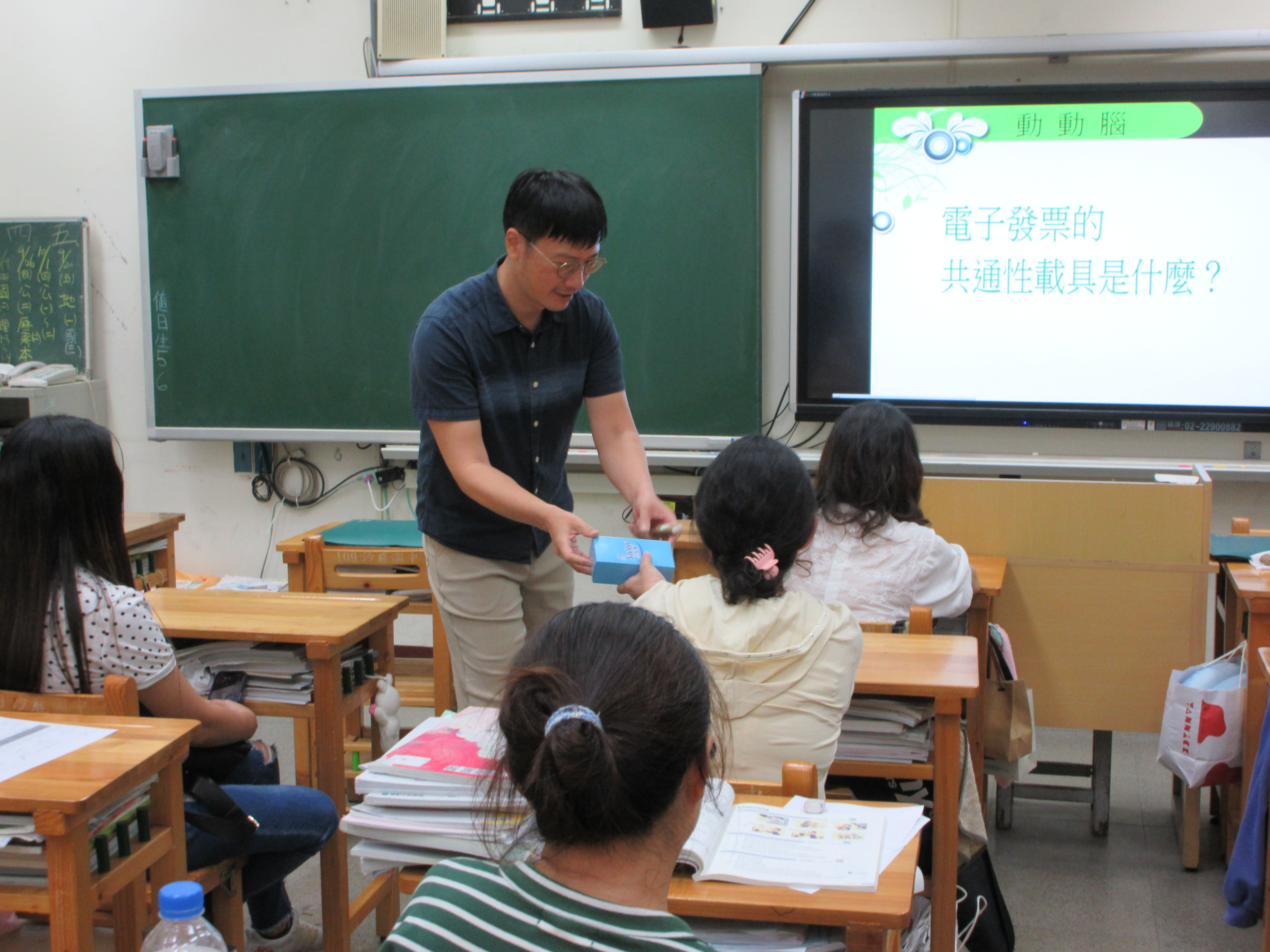 講師透過有獎問答的方式向同學介紹電子載具的便利性,鼓勵大家消費索取雲端發票。